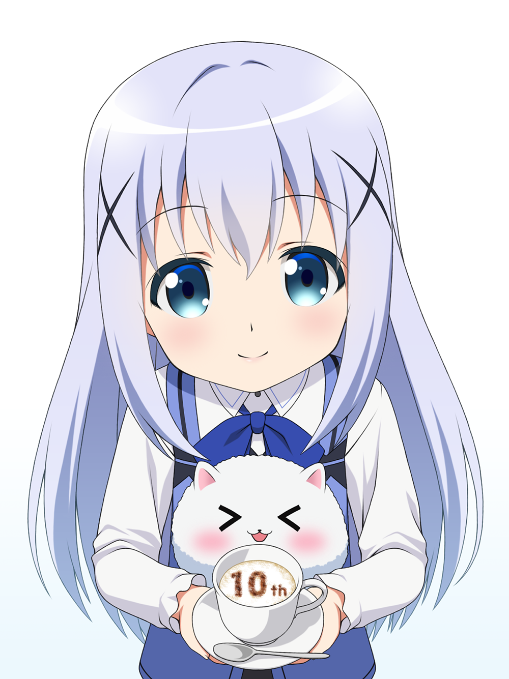 1girl angora_rabbit animal anniversary blue_bow blue_eyes blue_hair blue_vest bow closed_mouth collared_shirt commentary_request cup gaou_(babel) gochuumon_wa_usagi_desu_ka? hair_ornament highres holding holding_saucer kafuu_chino latte_art long_hair rabbit rabbit_house_uniform saucer shirt simple_background smile spoon tippy_(gochiusa) upper_body very_long_hair vest waitress white_background white_shirt x_hair_ornament