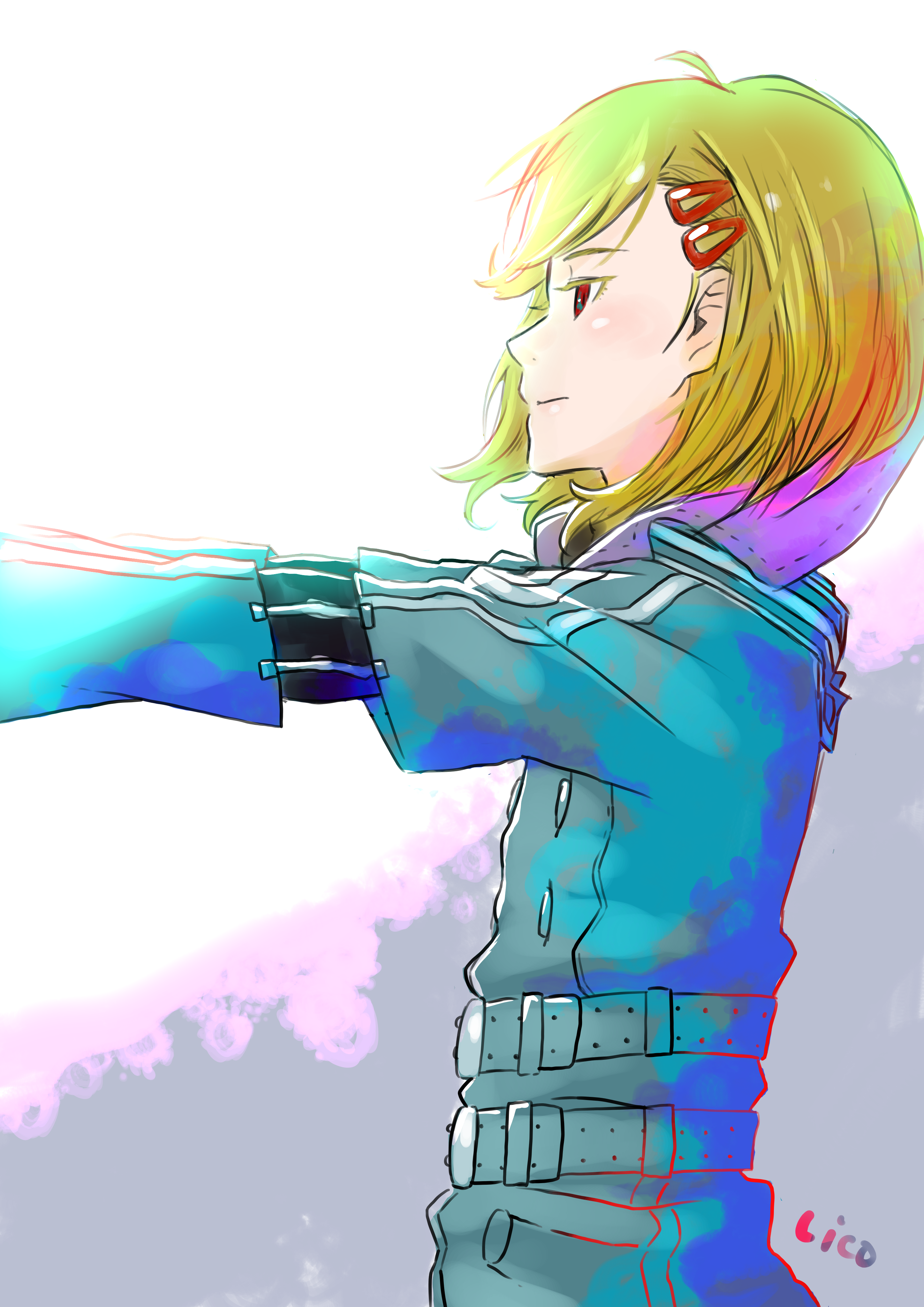 1other absurdres antenna_hair aqua_coat artist_name blonde_hair coat fingerless_gloves gloves gnosia hair_ornament hairclip highres lico_(sasya_k) long_hair looking_at_viewer red_eyes setsu_(gnosia) short_hair simple_background solo turtleneck