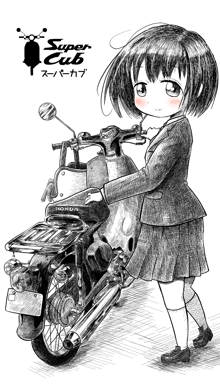 ahoge black_eyes black_hair blush bob_cut copyright_name gotthi greyscale helmet highres honda honda_super_cub koguma_(super_cub) long_sleeves looking_at_viewer looking_back messy_hair mirror monochrome moped motor_vehicle motorcycle motorcycle_helmet school_uniform scooter short_hair skirt super_cub