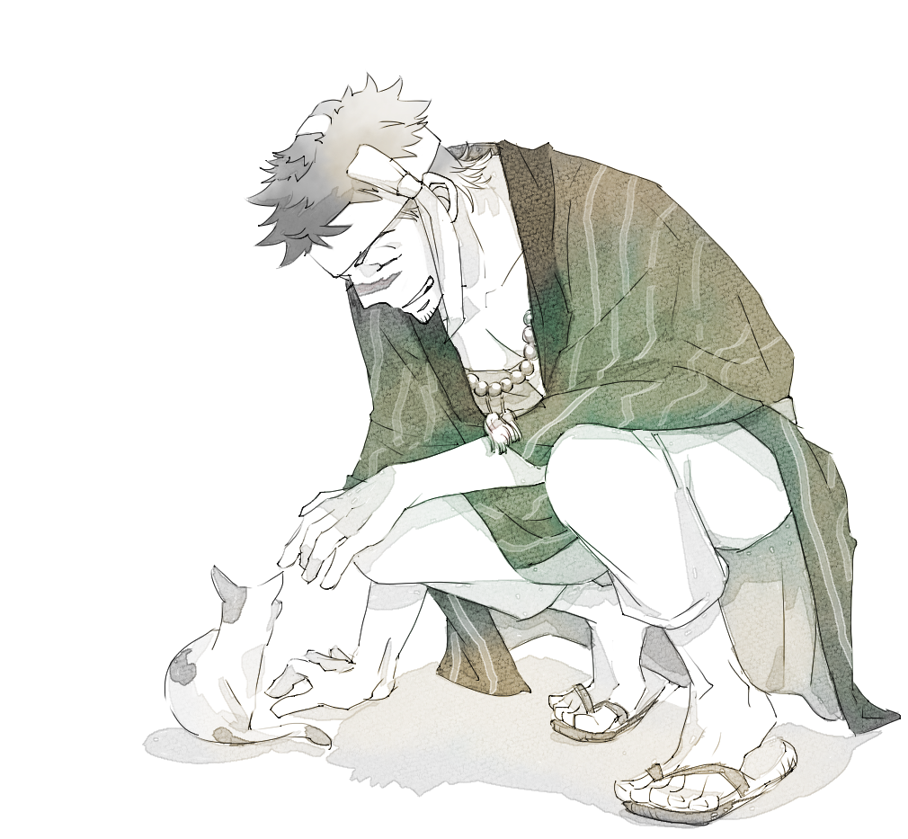 1boy cat closed_eyes grin headband iichikamichi japanese_clothes jewelry kimono male_focus necklace open_clothes open_kimono revenger sandals scar scar_on_face scar_on_nose shorts simple_background smile solo souji_(revenger) squatting white_background