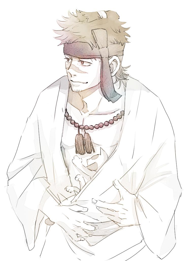 1boy cat collarbone facial_hair headband iichikamichi japanese_clothes jewelry kimono male_focus monochrome necklace revenger scar scar_on_face scar_on_nose short_hair simple_background solo souji_(revenger) stubble toned toned_male white_background wide_sleeves