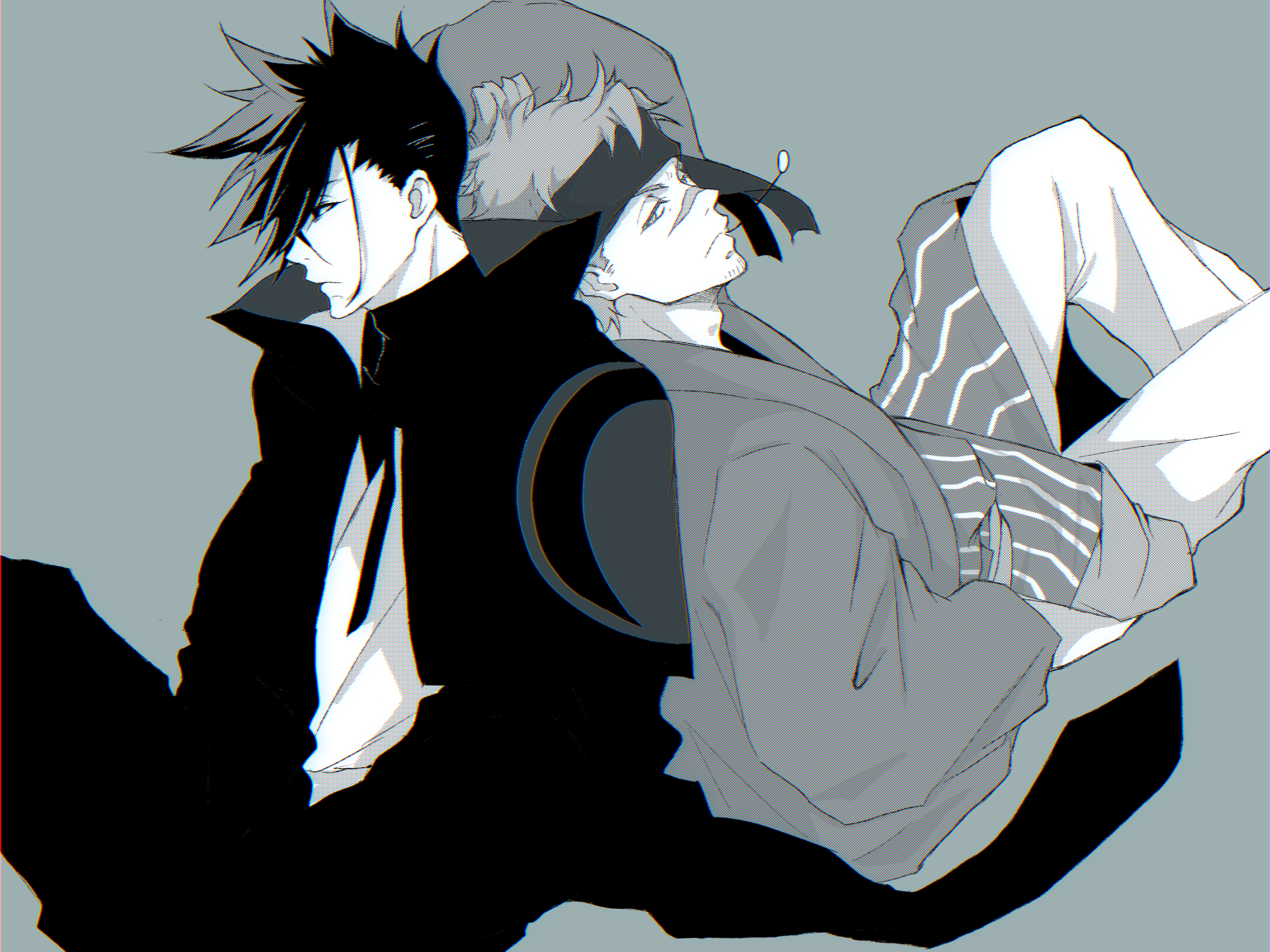 2boys cloak facial_hair grey_background greyscale hair_over_one_eye headband highres japanese_clothes kimono kurima_raizou looking_at_viewer male_focus miosaka0000 monochrome mouth_hold multiple_boys revenger scar scar_on_face scar_on_nose short_hair sitting souji_(revenger) stubble wide_sleeves