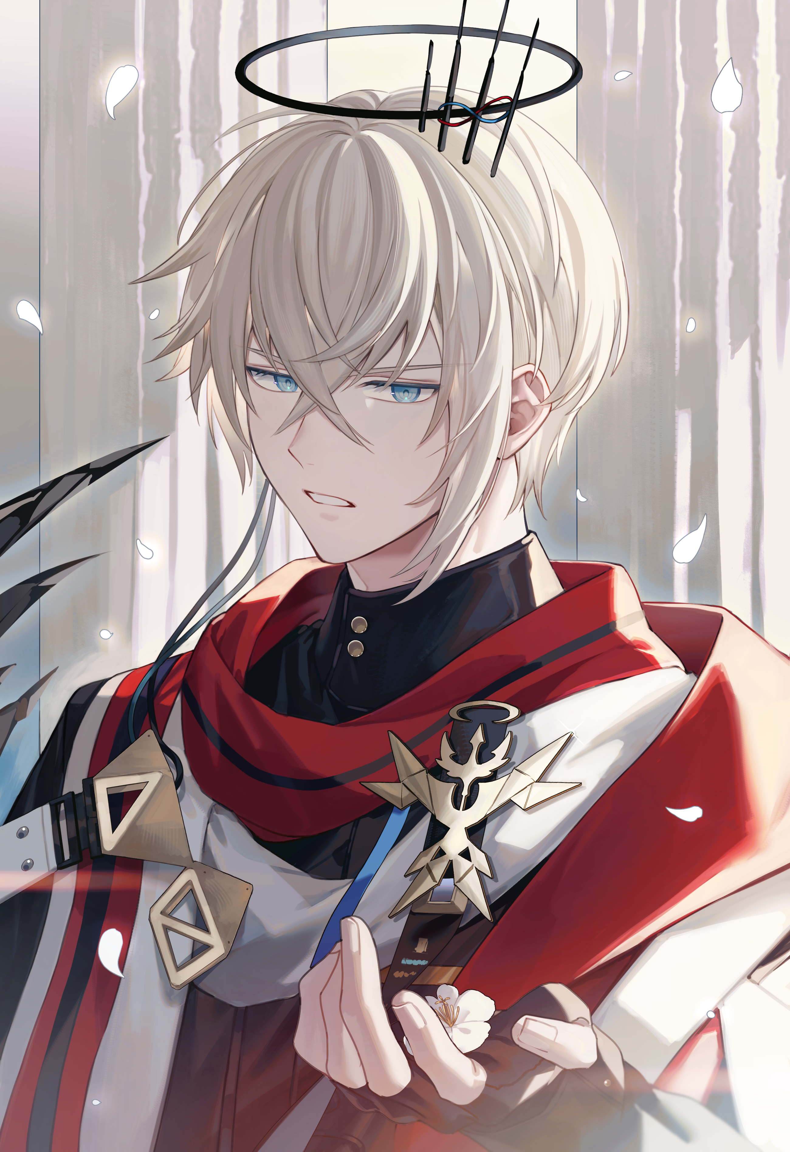 1boy absurdres arknights black_wings blonde_hair blue_eyes executor_(arknights) executor_the_ex_foedere_(arknights) falling_petals fingerless_gloves flower gloves hair_between_eyes halo highres iyo_(iyoo) looking_at_viewer male_focus petals short_hair solo upper_body white_flower wings