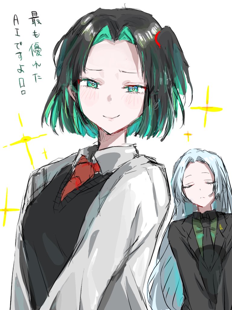 2girls allmind_(armored_core_vi) allmind_(armored_core_vi)_(cosplay) angela_(project_moon) angela_(project_moon)_(cosplay) aqua_eyes aqua_hair armored_core armored_core_vi:_fires_of_rubicon black_coat black_necktie black_sweater_vest blue_hair blush closed_eyes closed_mouth coat collared_shirt colored_inner_hair cosplay heart_skzo lab_coat lobotomy_corporation long_hair looking_at_viewer multicolored_hair multiple_girls necktie parted_bangs personification project_moon red_necktie shirt simple_background sweater_vest translation_request very_long_hair white_background white_coat white_shirt