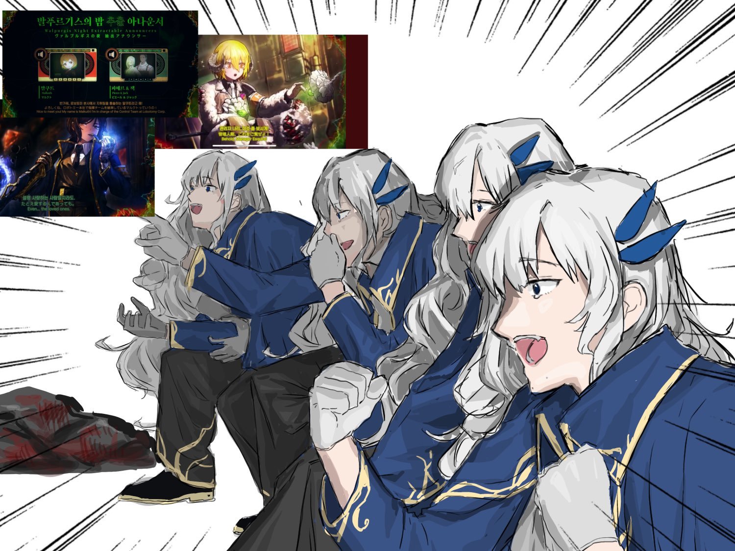 4boys argalia_(project_moon) black_footwear black_pants blue_cape blue_jacket cape clone collared_jacket don_quixote_(project_moon) e.g.o_(project_moon) gaijin_4koma_(meme) game_screenshot_inset gloves gold_trim hands_up heart_skzo jack_(project_moon) jacket lantern_(e.g.o) library_of_ruina limbus_company lobotomy_corporation long_hair magic_bullet_(e.g.o) malkuth_(project_moon) meme multiple_boys open_mouth outis_(project_moon) pants pierre_(project_moon) project_moon shoes sidelocks simple_background smile very_long_hair white_background white_gloves white_hair