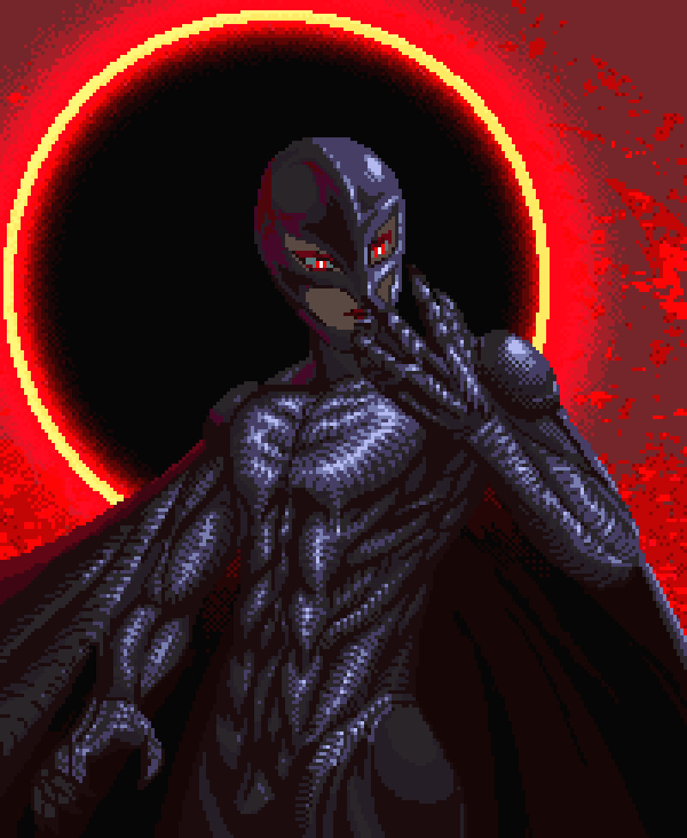 1boy allan_dias berserk cape claws cowboy_shot eclipse eyeshadow femto_(berserk) griffith_(berserk) helmet highres makeup male_focus pixel_art red_eyes red_eyeshadow red_lips solo