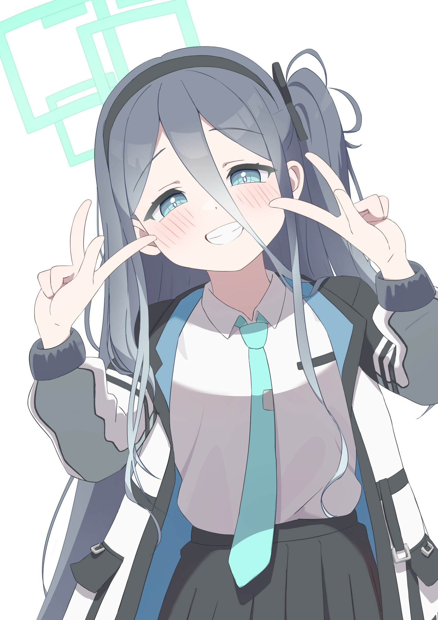 1girl aqua_halo aqua_necktie aris_(blue_archive) black_hair black_hairband black_skirt blue_archive blue_eyes blush coat collared_shirt commentary_request cowboy_shot double_v hair_between_eyes hairband halo highres kumacy_0 leaning_to_the_side long_hair long_hair_between_eyes looking_at_viewer necktie one_side_up open_mouth rectangular_halo shirt shirt_tucked_in simple_background skirt smile solo v very_long_hair white_background white_shirt