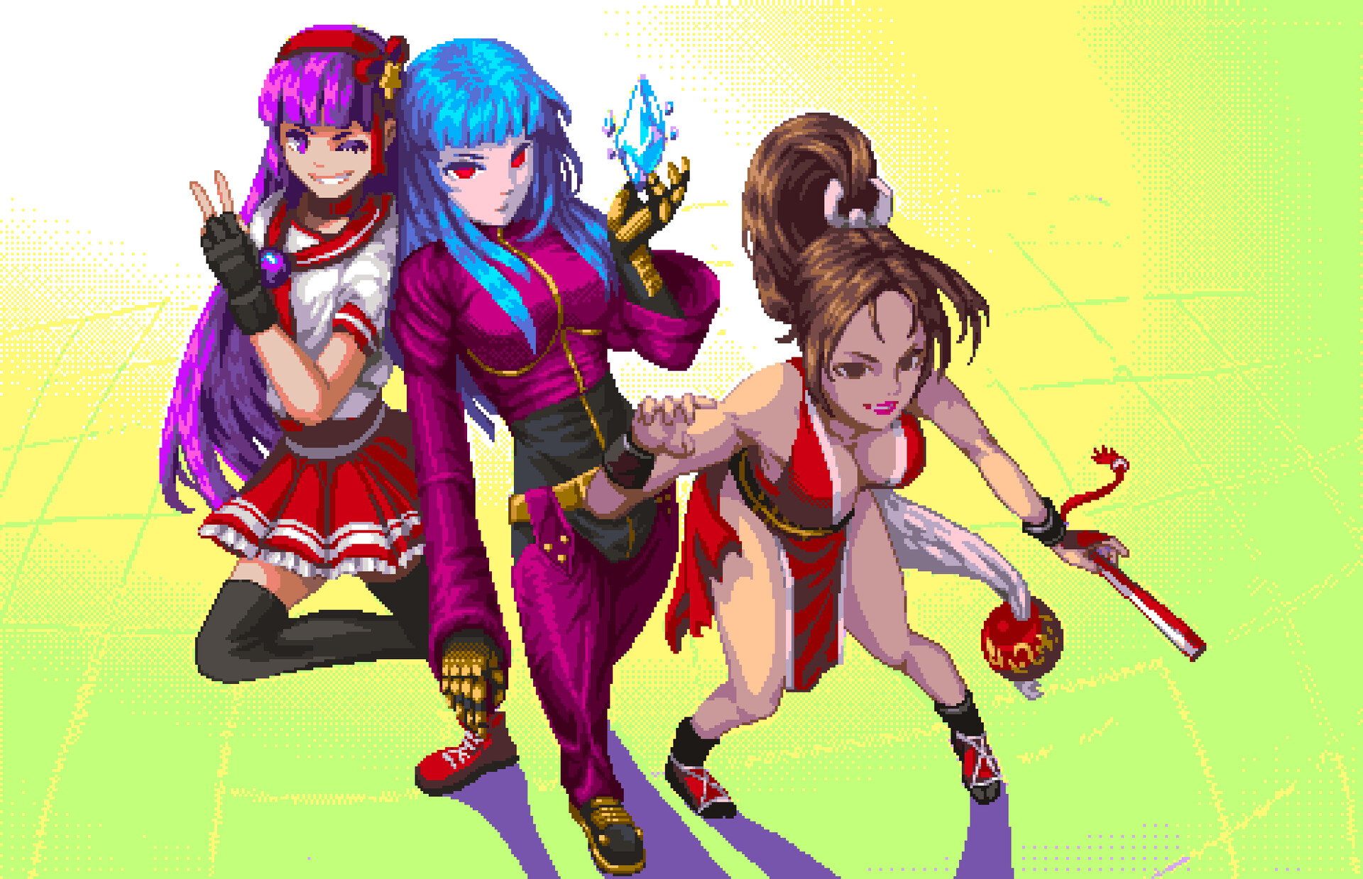 3girls allan_dias asamiya_athena black_gloves black_thighhighs blue_hair blunt_bangs breasts brown_hair cleavage crystal female_focus fingerless_gloves full_body gauntlets gloves hairband hand_fan high_ponytail highres holding holding_fan kula_diamond large_breasts long_hair multiple_girls one_eye_closed parted_bangs pixel_art pleated_skirt ponytail purple_eyes purple_hair red_eyes red_footwear red_hairband red_lips red_sailor_collar red_skirt sailor_collar school_uniform serafuku shiranui_mai skirt smirk snk standing standing_on_one_leg teeth the_king_of_fighters thighhighs v wink