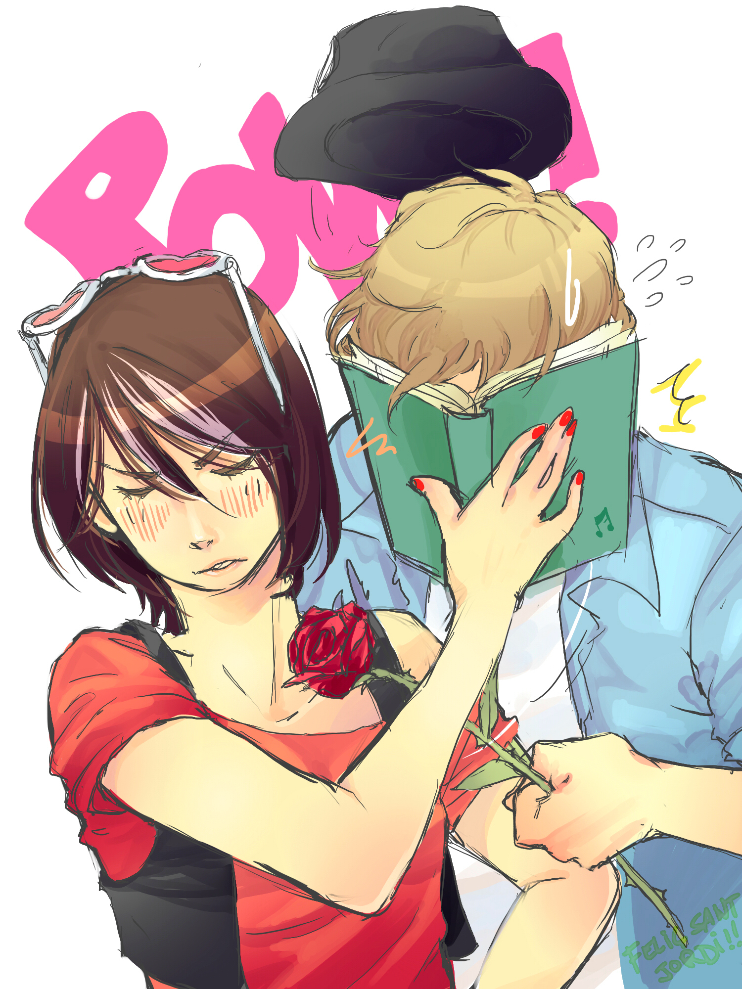 1boy 1girl black_headwear black_vest blonde_hair blue_jacket blush book brown_hair bruno_(vocaloid) clara_(vocaloid) closed_mouth collarbone commentary english_commentary flower flying_sweatdrops head_tilt heart heart-shaped_eyewear highres holding holding_book holding_flower jacket multicolored_hair red-tinted_eyewear red_flower red_nails red_shirt rumple_(artist) shirt short_hair simple_background sketch streaked_hair sweatdrop tinted_eyewear tsundere vest vocaloid white-framed_eyewear white_background white_hair white_shirt