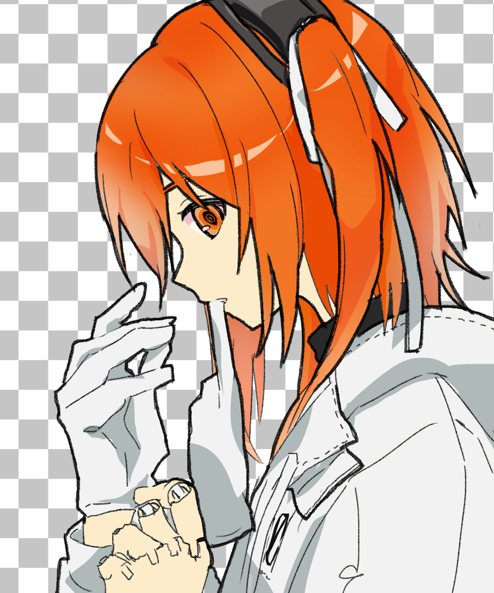 1girl a.i._voice adachi_rei android checkered_background from_side gloves grey_background hair_ribbon hands_up hidaka_ui highres jacket joints long_sleeves medium_hair mouth_hold one_side_up orange_eyes orange_hair profile putting_on_gloves ribbon robot_joints single_glove solo upper_body utau white_gloves white_jacket white_ribbon