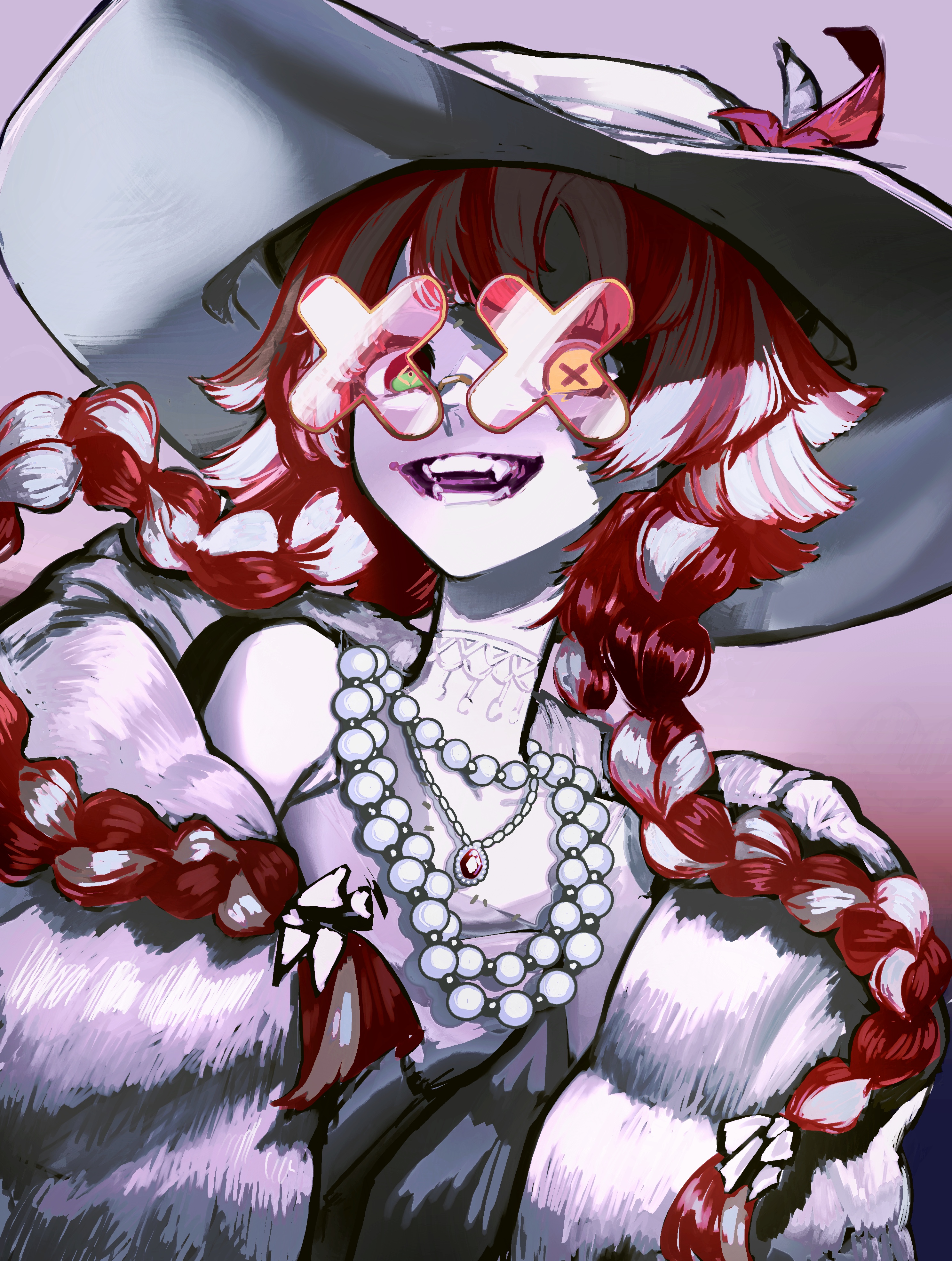 1girl absurdres bare_shoulders braid choker coat colored_skin colored_tongue commentary diamond-shaped_pupils diamond_(shape) dress fangs fur_coat green_eyes grey_skin heterochromia highres hololive hololive_indonesia jewelry kureiji_ollie kureiji_ollie_(mafia_princess) long_hair looking_at_viewer low_twin_braids mismatched_pupils multicolored_hair multicolored_skin necklace official_alternate_costume open_mouth patchwork_skin pearl_necklace pink-tinted_eyewear pungson_mori purple_tongue red_hair sharp_teeth sleeveless sleeveless_dress smile solo stitched_face stitched_torso stitches sunglasses symbol-shaped_pupils teeth tinted_eyewear twin_braids twintails two-tone_skin upper_body virtual_youtuber white_choker white_coat white_dress white_hair x-shaped_eyewear x-shaped_pupils zombie