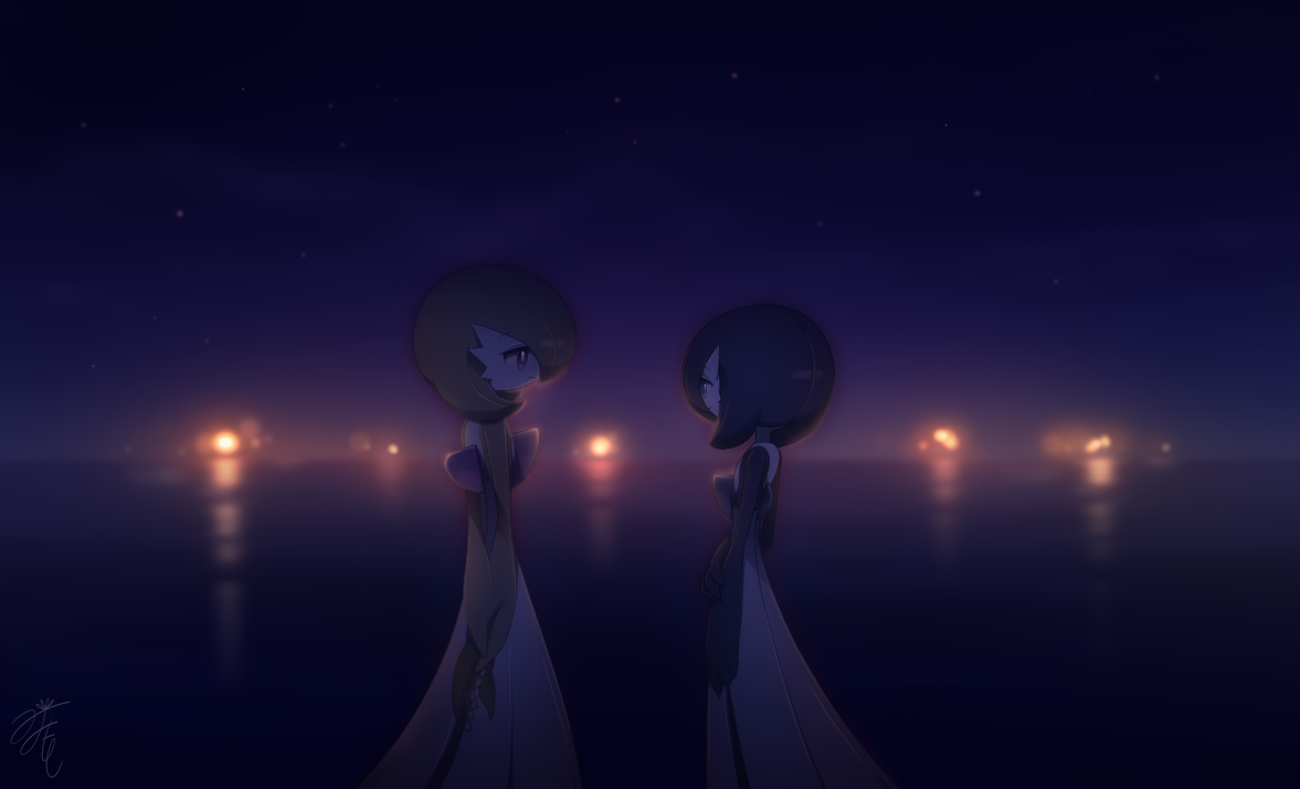 arms_behind_back bob_cut colored_skin dress gardevoir gen_3_pokemon green_hair hand_on_own_arm horizon lotosu multicolored_skin night nintendo ocean pokemon pokemon_(creature) signature sky smile two-tone_skin white_dress white_skin