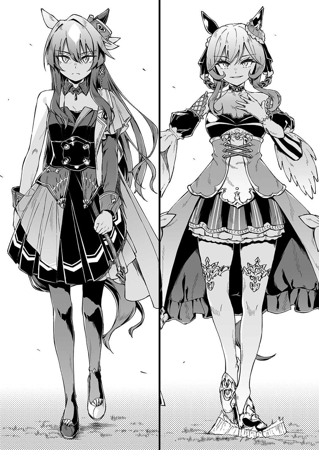 2girls animal_ears asymmetrical_clothes braid braided_hair_rings breasts capelet ear_covers full_body gentildonna_(regina_dei_fiori)_(umamusume) gentildonna_(umamusume) greyscale hair_between_eyes hair_rings hand_on_own_chest heart-shaped_ornament highres horse_ears horse_girl horse_tail kazushiki_midori large_breasts long_hair monochrome multicolored_hair multiple_girls simple_background single_ear_cover streaked_hair strong tail umamusume verxina_(le_beau_sommet)_(umamusume) verxina_(umamusume) walking white_background