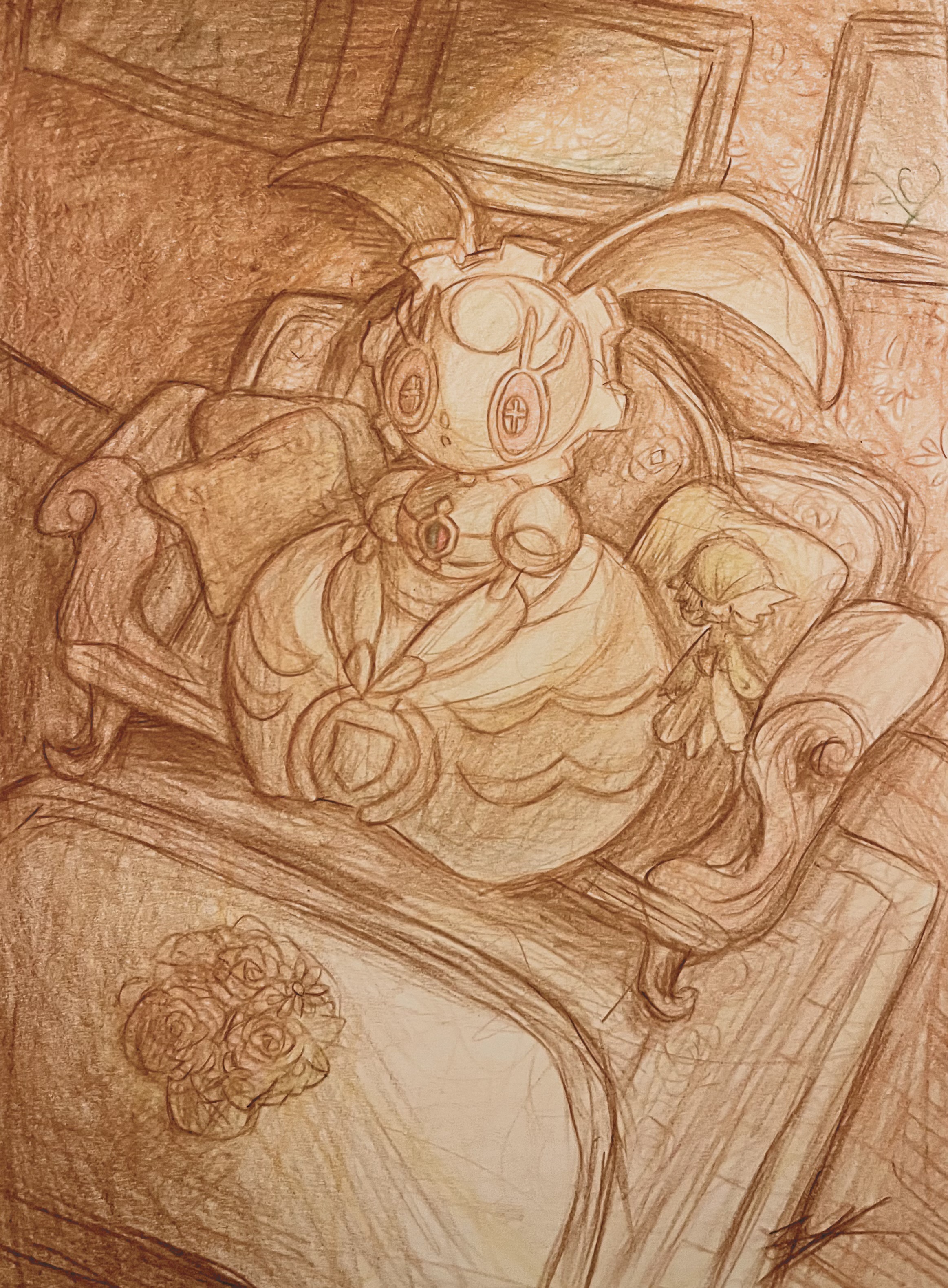 +_+ 1girl absurdres artist_name chair character_doll cushion doll female_focus flower full_body gardevoir gen_3_pokemon gen_7_pokemon highres humanoid_robot indoors legendary_pokemon magearna magearna_(normal) monochrome mythical_pokemon neverland+ nintendo on_chair open_mouth picture_frame pokemon pokemon_(creature) robot signature sitting sketch solo table traditional_media vase