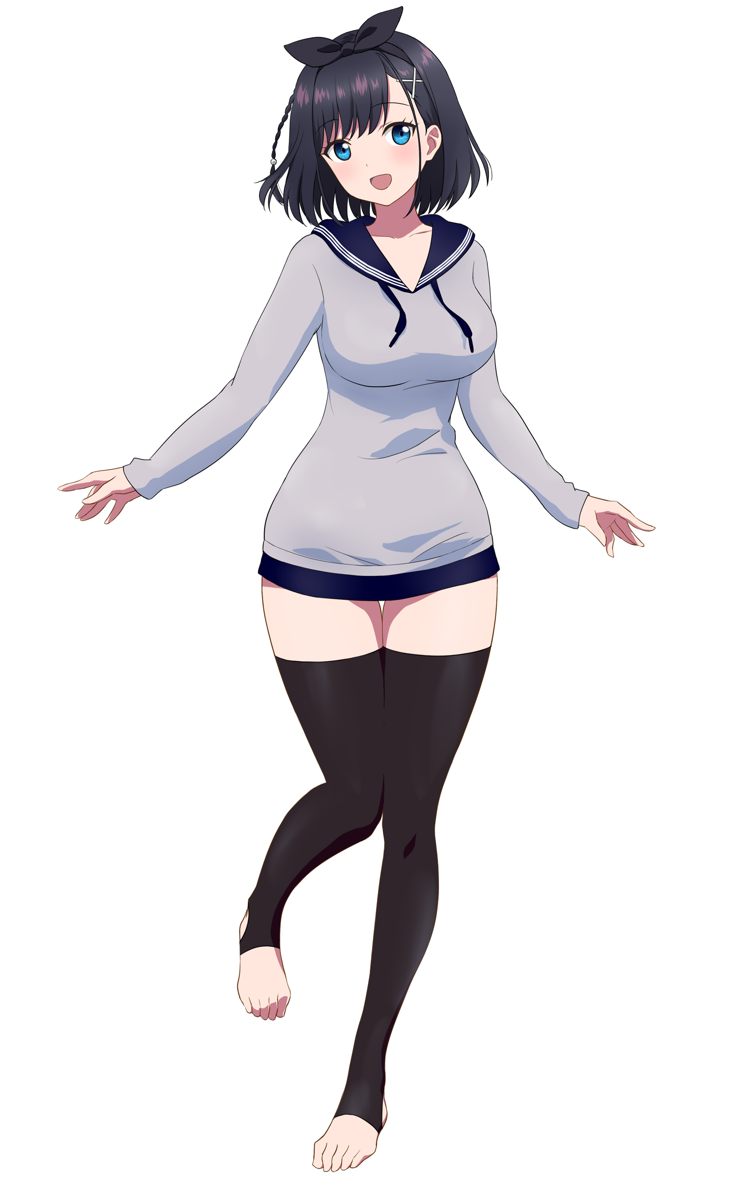 1girl :d absurdres aika_(amatsuji) barefoot black_hair black_ribbon black_thighhighs blue_eyes blue_sailor_collar blue_skirt blush borrowed_character braid breasts commentary commission curvy eyelashes feet full_body grey_shirt hair_between_eyes hair_ornament hair_ribbon happy high_heels highres knees_together_feet_apart komatsu_(sakanae) large_breasts long_sleeves looking_at_viewer medium_hair miniskirt open_mouth original pixiv_commission ribbon sailor_collar shirt simple_background single_braid skirt sleeves_past_wrists smile solo standing stirrup_legwear straight_hair thigh_gap thighhighs thighs toeless_legwear toes transparent_background x_hair_ornament zettai_ryouiki