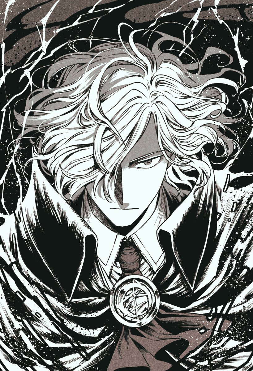 +_+ 1boy ascot aura cloak edmond_dantes_(fate) fate/grand_order fate_(series) greyscale hair_over_one_eye highres male_focus monochrome portrait yuuzuki230