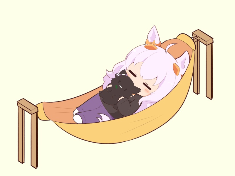 1girl ahoge animal animal_ears animalization biwa_hayahide_(umamusume) black_cat black_shirt blush_stickers brown_background cat chibi closed_eyes ear_ornament gomashio_(goma_feet) hammock horse_ears horse_girl horse_tail long_sleeves lying mouth_hold narita_brian_(racehorse) narita_brian_(umamusume) on_back pants purple_pants shirt simple_background sleeves_past_wrists stalk_in_mouth tail umamusume |_|