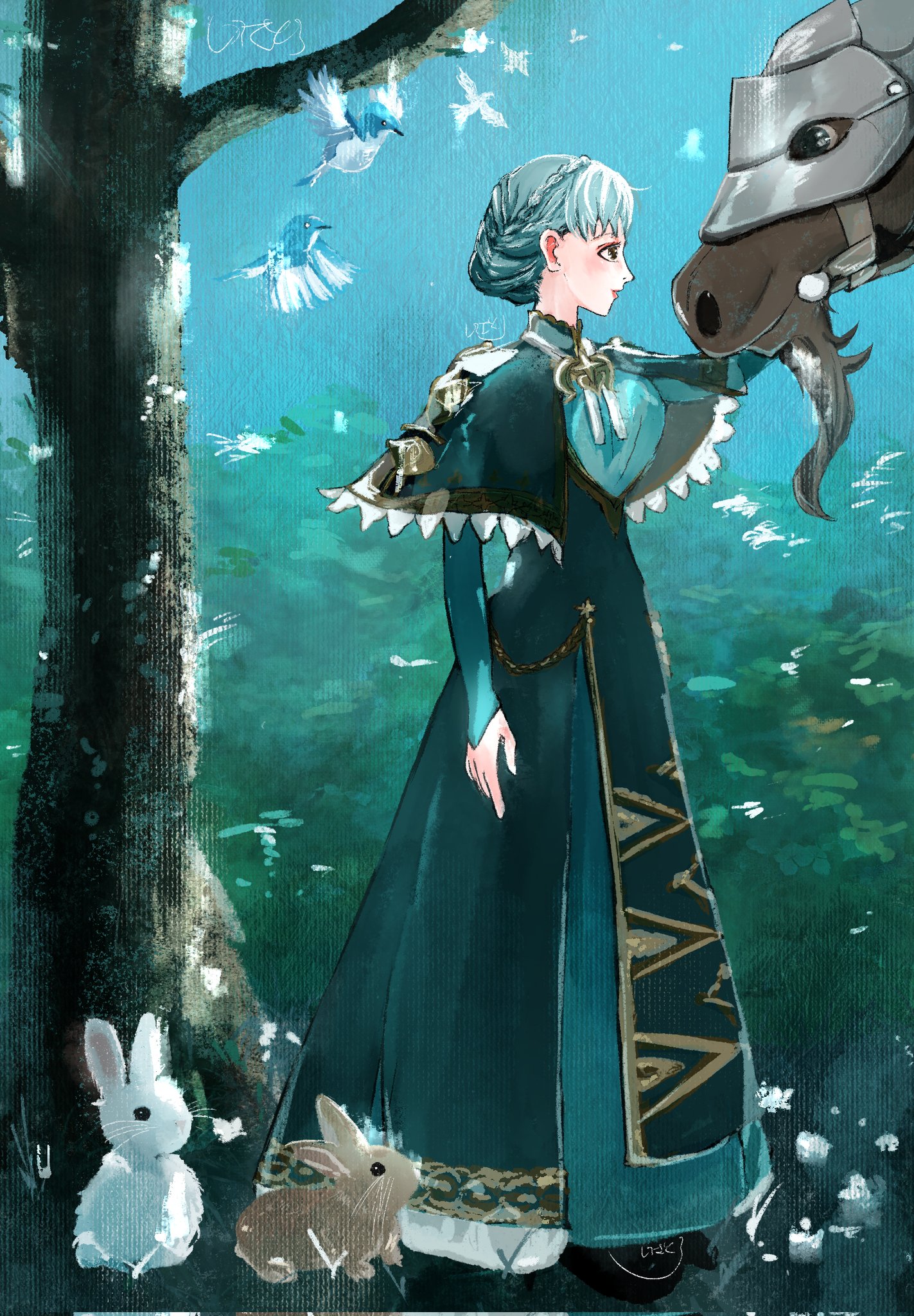1girl bird blue_dress blue_hair braid brown_rabbit commentary_request corrupted_twitter_file crown_braid dress fire_emblem fire_emblem:_three_houses floating full_body gold_trim highres horse long_dress marianne_von_edmund marianne_von_edmund_(timeskip) nintendo outdoors rabbit shiro_zakuro short_hair signature simple_bird standing tree white_rabbit_(animal)