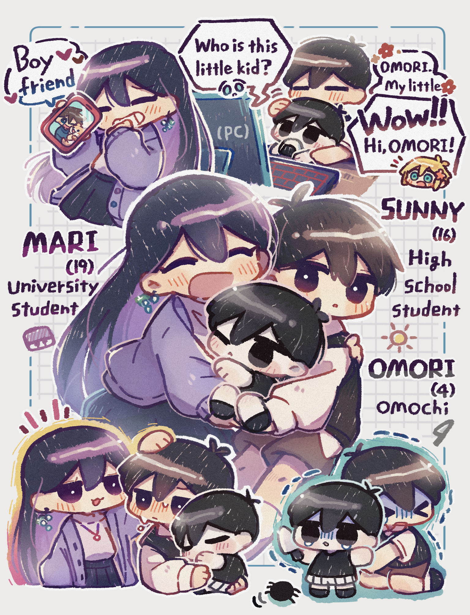 1girl 2boys :3 alternate_universe basil_(faraway)_(omori) basil_(omori) black_eyes black_hair blush bright_pupils brother_and_sister brothers bug cellphone chibi chibi_inset closed_mouth colored_skin computer earrings english_text food grin hero_(faraway)_(omori) hero_(omori) highres holding holding_phone jewelry laptop long_hair long_sleeves looking_at_another mari_(faraway)_(omori) mari_(omori) multiple_boys necklace omori omori_(omori) onigiri open_mouth parted_lips phone siblings smartphone smile speech_bubble spider sunny_(omori) teeth wakame_(vhai26uhykmqb9k) white_pupils white_skin