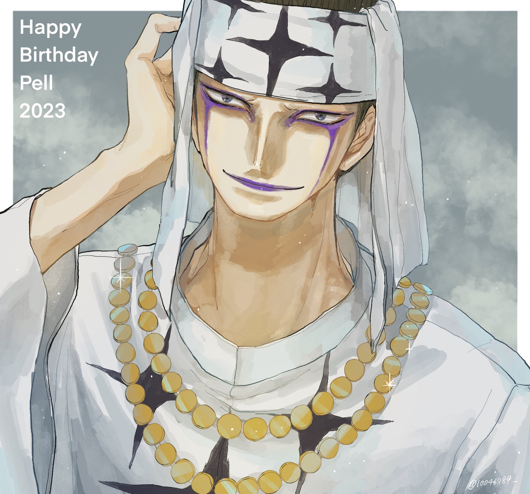 1boy 2023 close-up facial_mark grey_background hand_on_own_head happy_birthday headband headscarf highres jewelry long_sleeves looking_at_viewer male_focus necklace one_piece pell_(one_piece) purple_lips shokusei smile solo tunic twitter_username white_tunic