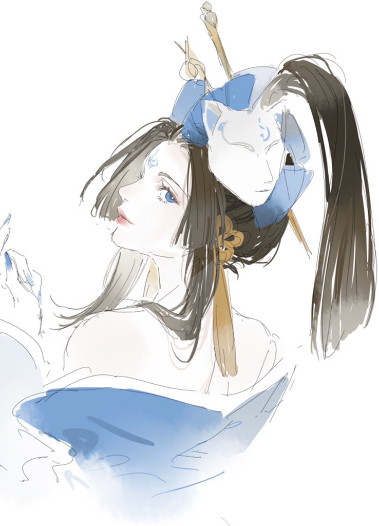 1girl bare_shoulders bity3155660241 black_hair blue_dress blue_eyes blue_nails blue_sleeves chinese_hairpin closed_mouth commentary_request cropped_torso dress eyelashes facial_mark flower_knot forehead_mark fox_mask from_behind hair_ornament high_ponytail light_smile lipstick long_hair long_sleeves looking_at_viewer looking_back makeup mask mask_on_head nail_polish original pink_lips ponytail simple_background solo tassel tassel_hair_ornament white_background white_mask