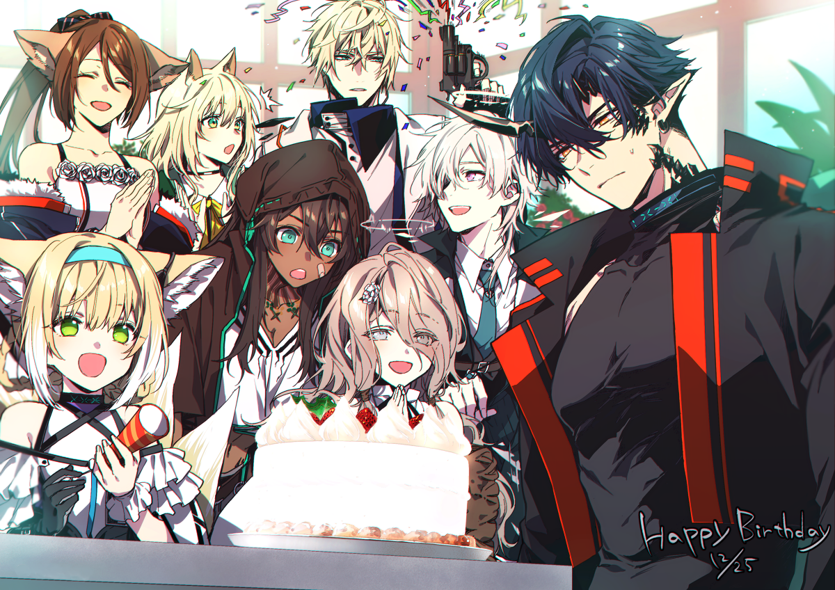 3boys 5girls animal_ears arknights birthday_cake black_hair black_jacket blonde_hair blue_eyes cake cat_ears cecelia_(arknights) dark_skin enforcer_(arknights) executor_(arknights) flamebringer_(arknights) flint_(arknights) food green_eyes horns jacket multiple_boys multiple_girls orange_eyes pectorals perfumer_(arknights) podenco_(arknights) sleeveless sleeveless_turtleneck suzuran_(arknights) toriyoshi turtleneck