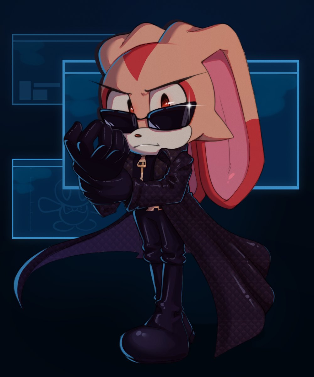 >:( adjusting_clothes adjusting_gloves albert_wesker albert_wesker_(cosplay) black_footwear black_gloves black_jacket black_pants black_shirt cosplay cream_the_rabbit frown gloves highres jacket leather leather_gloves leather_jacket mitsy orange_fur pants parody rabbit_girl resident_evil serious shirt shoes sonic_(series) sunglasses v-shaped_eyebrows very_long_ears zipper zipper_pull_tab