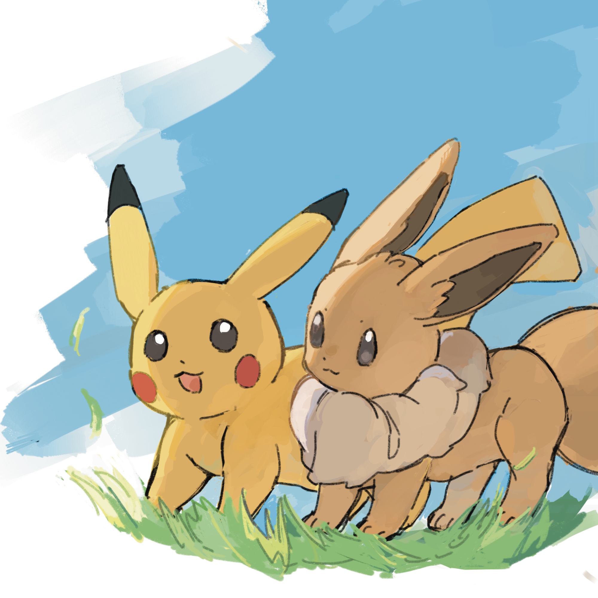 :3 animal_focus black_eyes blue_background blue_sky closed_mouth day eevee eye_contact full_body gen_1_pokemon grass happy highres looking_at_another neck_fur nintendo no_humans open_mouth outdoors pikachu pokemon pokemon_(creature) sky smile standing taishinten