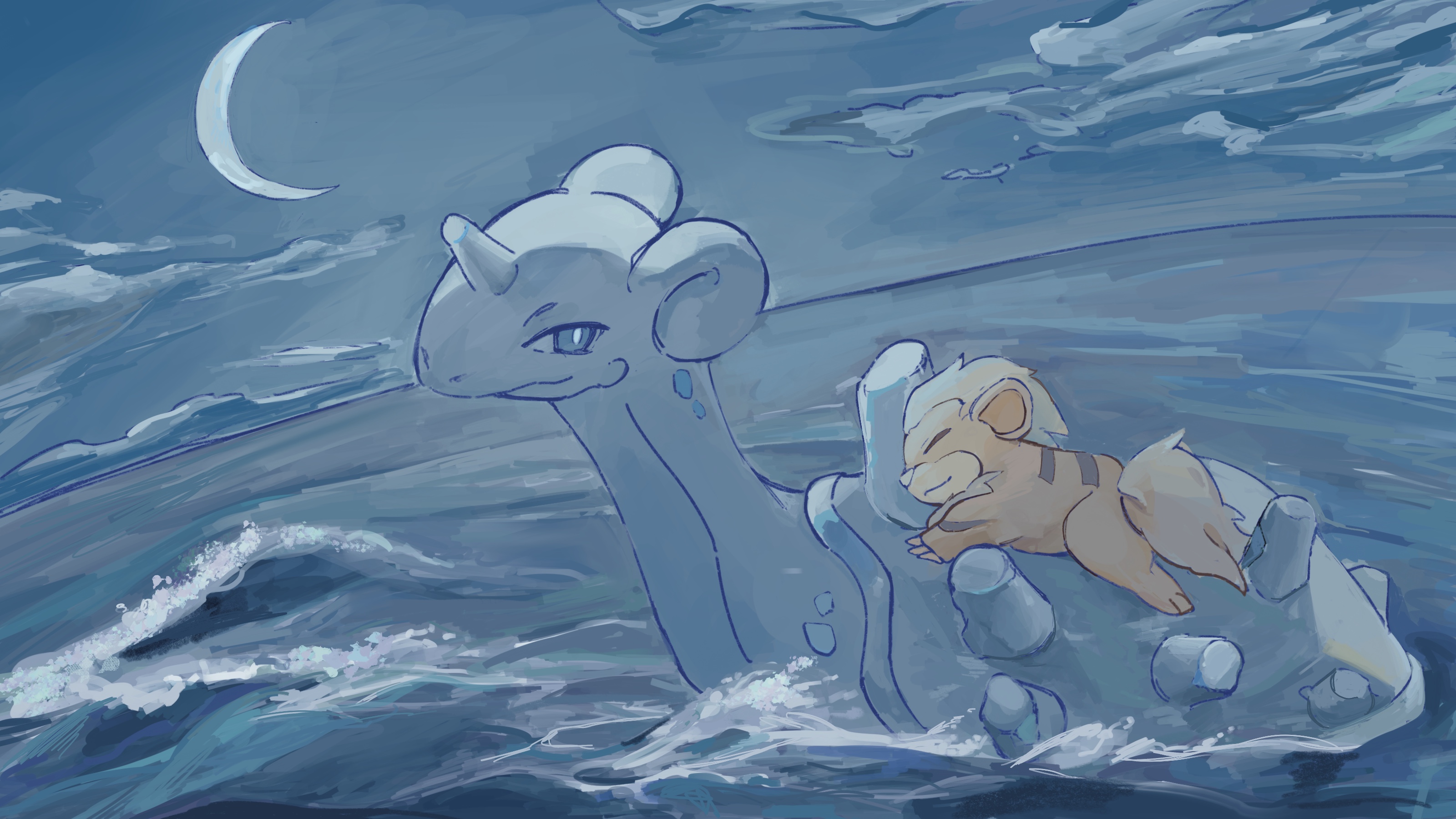 absurdres animal_focus blue_sky blue_theme closed_eyes closed_mouth cloud crescent_moon from_side gen_1_pokemon growlithe highres horizon lapras looking_at_viewer lying moon night nintendo no_humans ocean on_stomach outdoors partially_submerged pokemon pokemon_(creature) riding sky sleeping swimming taishinten