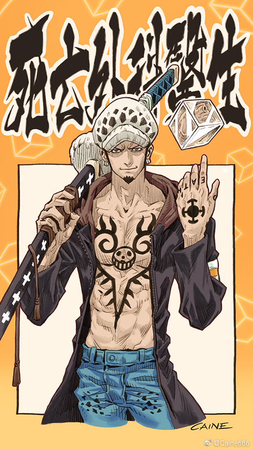 1boy abs artist_name black_hair caine666 closed_mouth earrings facial_hair finger_tattoo fur_hat goatee hand_tattoo hat heart_(organ) holding holding_sword holding_weapon jewelry long_sleeves looking_at_viewer male_focus one_piece open_clothes short_hair sideburns smile solo sword tattoo third-party_source trafalgar_law translation_request watermark weapon weibo_watermark