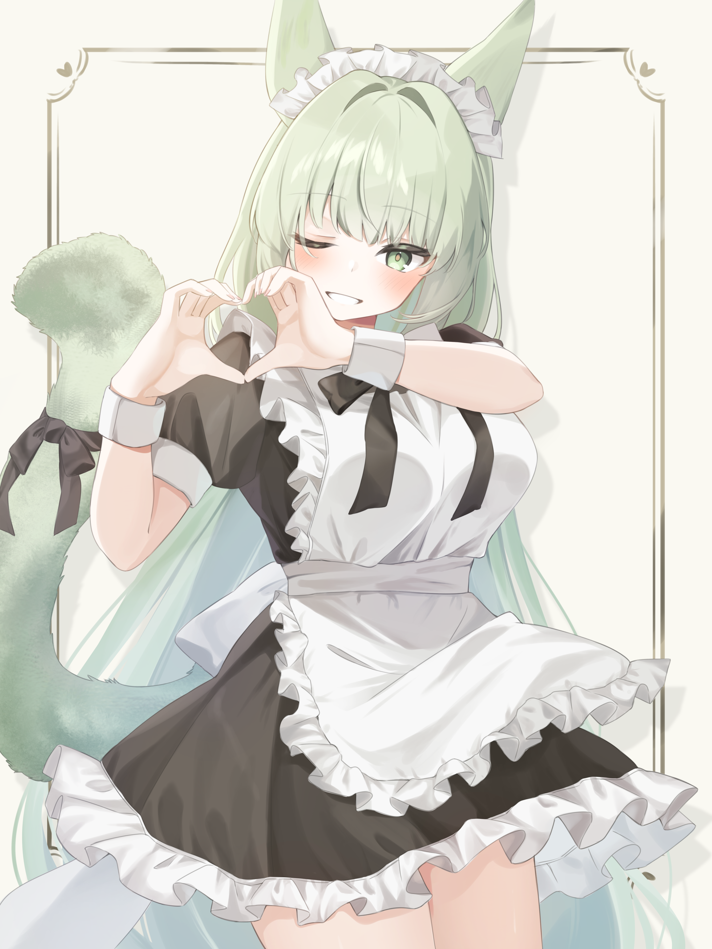 1girl ;d absurdres alternate_costume animal_ears apron arknights black_bow black_bowtie black_dress black_ribbon blush border bow bowtie cat_ears cat_girl cat_tail cowboy_shot dress enmaided frilled_apron frilled_dress frills green_eyes green_hair green_tail grey_background grin hair_intakes hands_up harmonie_(arknights) heart heart_hands highres long_hair looking_at_viewer maid maid_apron maid_headdress nishimiya_aki one_eye_closed open_mouth ornate_border puffy_short_sleeves puffy_sleeves ribbon short_sleeves smile solo standing tail tail_bow tail_ornament tail_raised tail_ribbon very_long_hair white_apron wrist_cuffs
