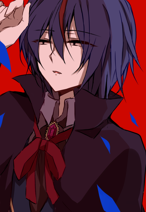 1boy alternate_costume black_capelet black_eyes blue_vest bluestar_iz capelet collared_shirt fangs gem hair_between_eyes hair_tubes hand_up looking_to_the_side male_focus official_art open_mouth purple_hair red_background red_eyes red_ribbon ribbon shirt short_hair single_hair_tube small_pupils solo vest white_shirt wilardo_adler witch's_heart
