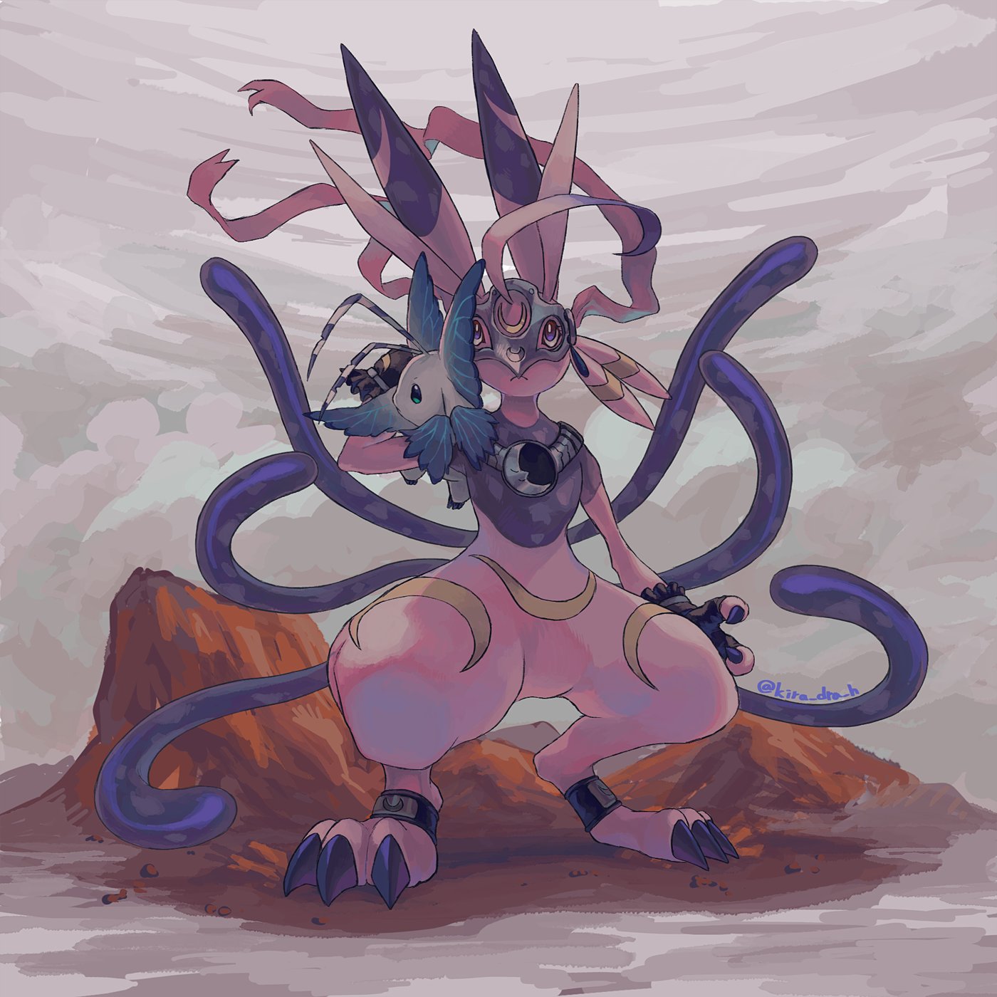 1girl antennae armor breastplate butterfly_wings colored_skin crescent digimon digimon_(creature) eye_mask fingerless_gloves gloves green_eyes highres holding insect_wings kira_(kira_dra) lekismon mask morphomon no_humans pink_skin purple_eyes rabbit twitter_username white_skin wings