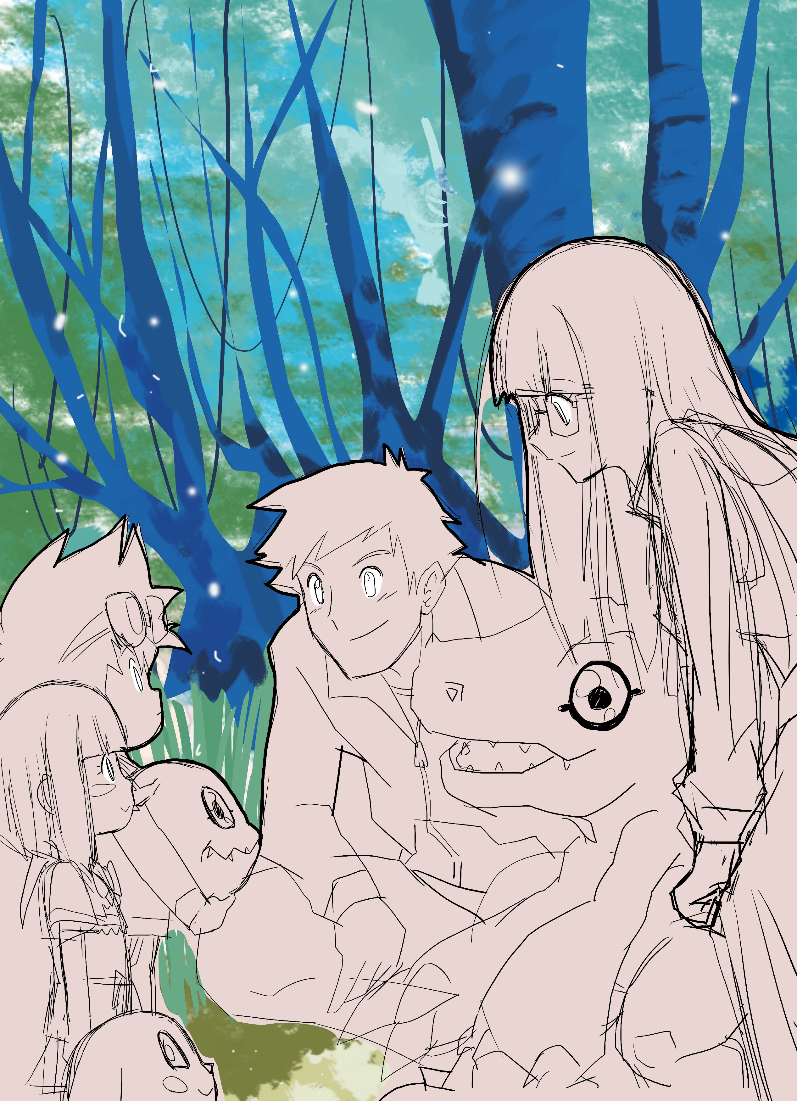 absurdres aged_up agumon curry_lun digimon digimon_(creature) digimon_adventure_02 family father_and_child father_and_daughter father_and_son goggles goggles_on_head highres husband_and_wife koromon long_hair looking_at_another meicoomon_child mochizuki_meiko mother_and_child mother_and_daughter mother_and_son parent_and_child sharp_teeth short_hair smile teeth yagami_taichi yagami_taichi's_son