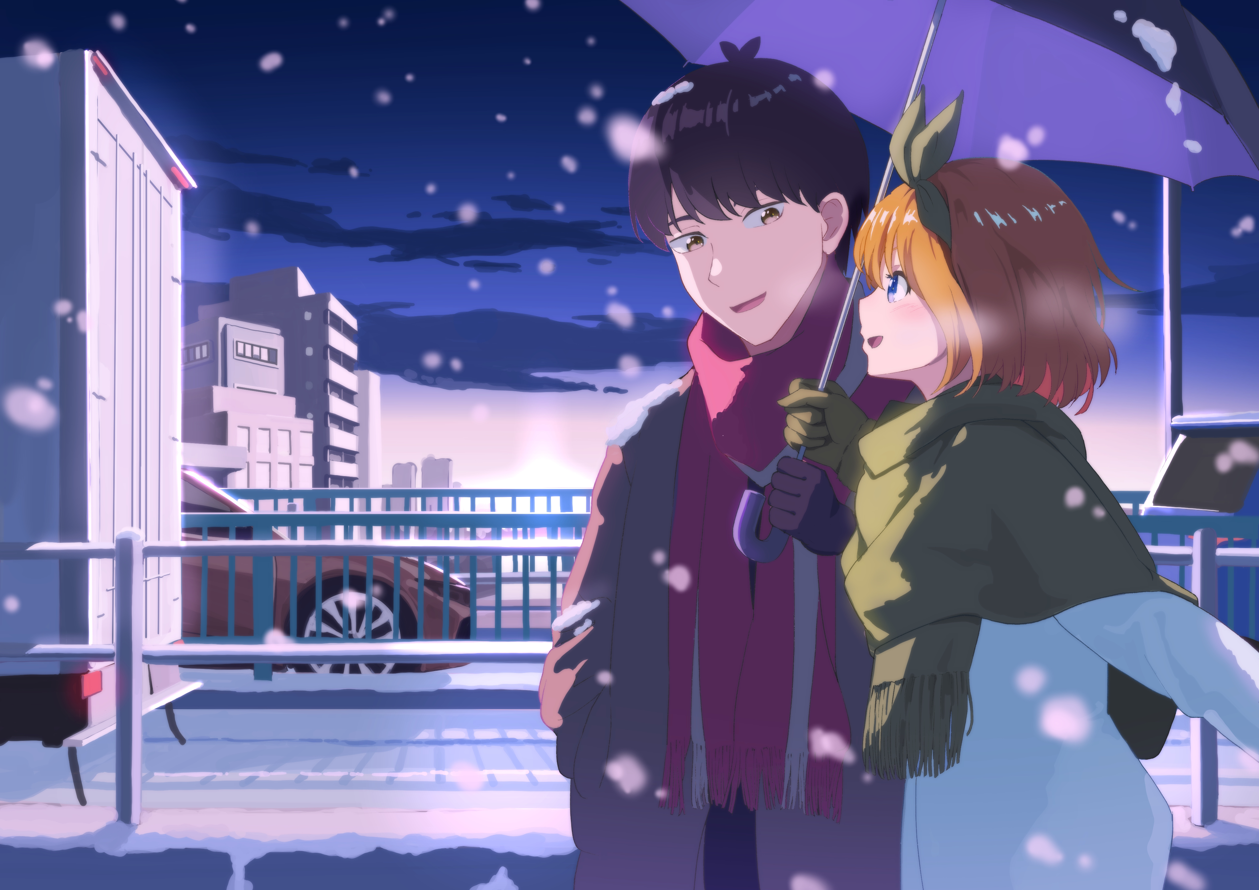 1boy 1girl :d absurdres alternate_costume antenna_hair black_gloves black_hair blue_eyes blurry blush breath brown_coat coat commentary couple depth_of_field eye_contact fringe_trim from_side gloves go-toubun_no_hanayome green_gloves green_ribbon green_scarf hair_between_eyes hair_ribbon hand_in_pocket happy hetero highres holding holding_umbrella looking_at_another medium_hair nakano_yotsuba night open_mouth orange_hair outdoors profile red_scarf ribbon scarf shared_umbrella short_hair smile snow snowing sunrise uesugi_fuutarou umbrella under_umbrella upper_body white_coat winter winter_clothes yasuba_yuichi yellow_eyes