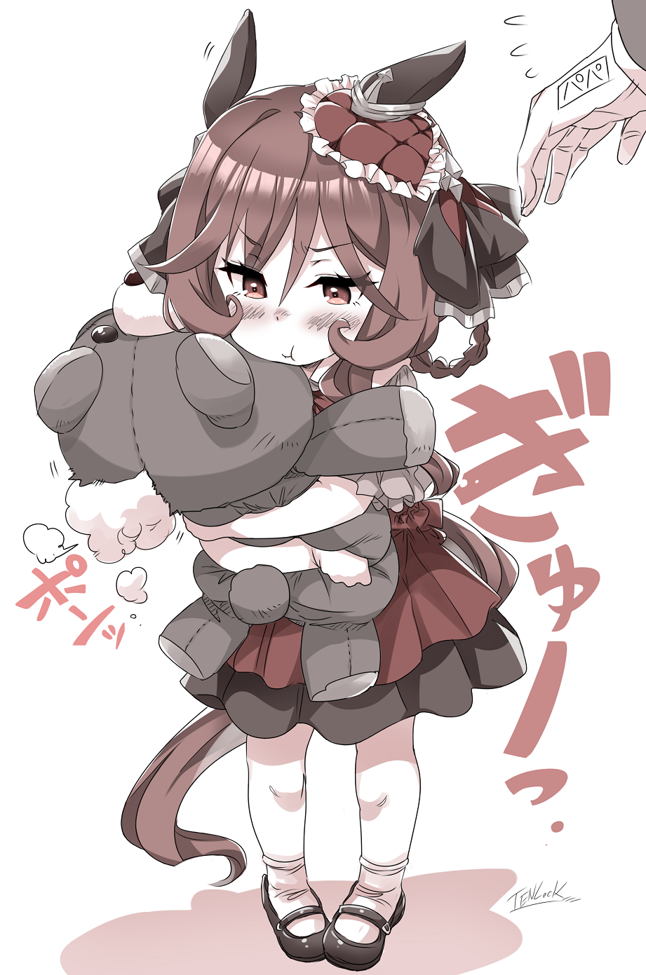 1girl :t aged_down animal_ears blush commentary_request father_and_child father_and_daughter flying_sweatdrops full_body gentildonna_(umamusume) hair_between_eyes hair_ornament hair_rings highres horse_ears horse_girl horse_tail hug hugging_object knees_apart_feet_together kugimiya_atsuki layered_skirt medium_hair monochrome parent_and_child pout sepia skirt solo_focus standing strong stuffed_animal stuffed_toy tail teddy_bear umamusume