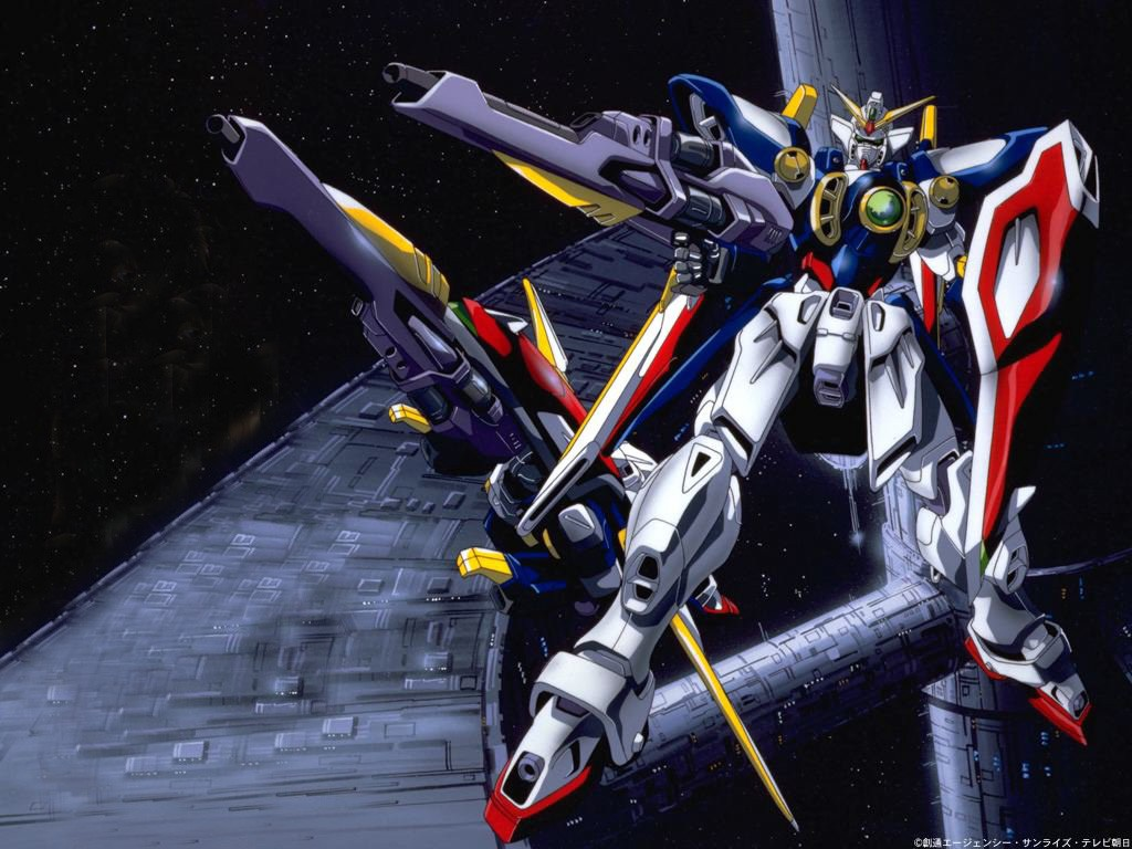 1990s_(style) artist_request beam_rifle buster_rifle energy_gun gun gundam gundam_battle_assault gundam_wing holding holding_shield holding_weapon humanoid_robot mecha mobile_suit no_humans official_art retro_artstyle rifle robot shield space space_habitat transformation v-fin weapon wing_gundam wings