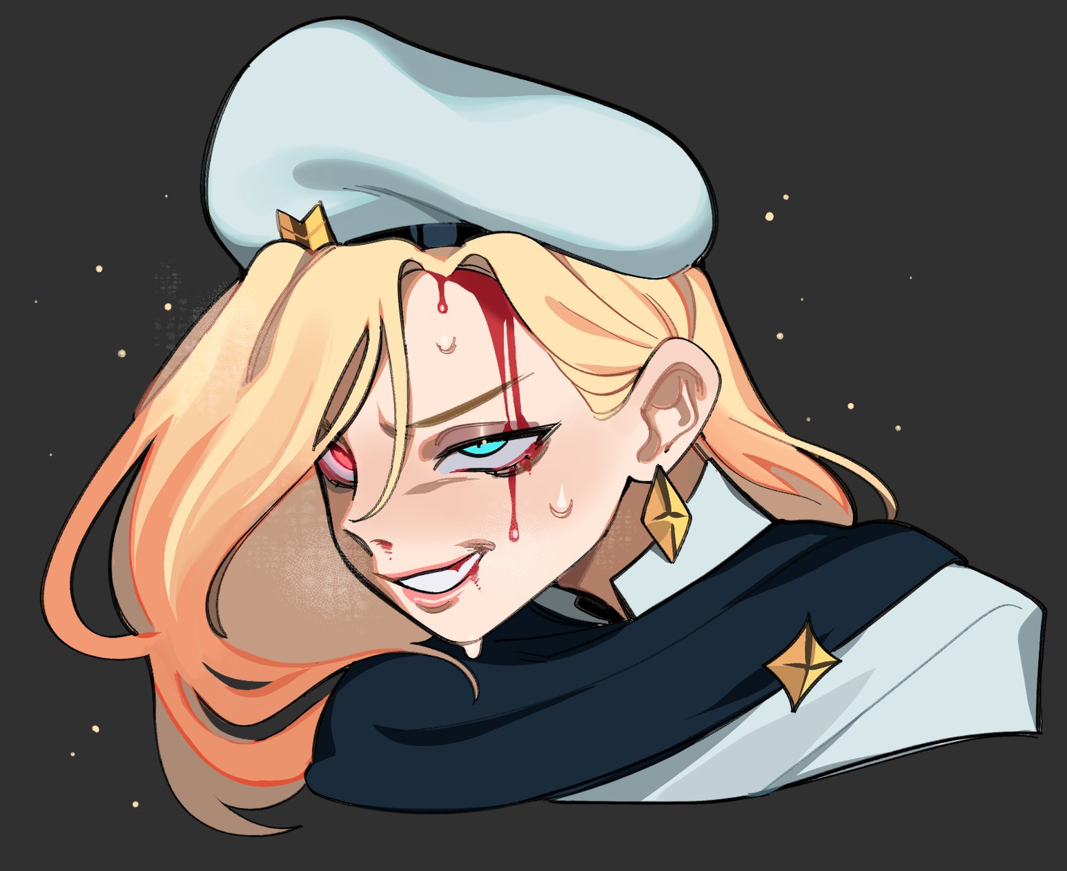 1girl aqua_eyes beret black_cape blonde_hair blood blood_in_mouth blood_on_face borrowed_character cape close-up earrings glowing glowing_eye hat heterochromia highres injury jacket jewelry multicolored_hair nosebleed orange_hair porqueloin portrait red_eyes simple_background solaria_(void_dot_exe) solo two-tone_hair white_hat white_jacket