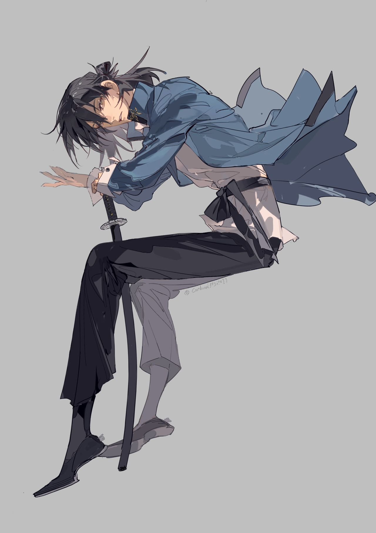 1boy belt black_footwear black_hair black_pants blue_jacket full_body grey_background highres invisible_chair jacket katana long_sleeves looking_at_viewer male_focus original pants ponytail sheath sheathed shirt simple_background sitting solo sword tansiki twitter_username weapon white_shirt