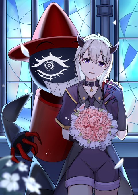 2boys :d black_gloves breeding church claws collarbone dave_and_bambi_mod demon demon_horns earrings expunged_(moldygh) fangs flower gloves hat helmet horns interspecies jewelry looking_at_viewer multiple_boys open_mouth original petals purple_eyes qilin7777 red_hat rin_vesper rose short_shorts shorts smile star_(symbol) teeth trap true_expunged white_hair window