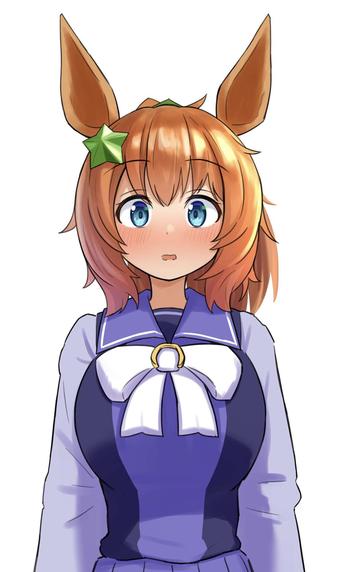 1girl blue_eyes blush bow breasts brown_hair commentary hair_between_eyes hair_ornament highres large_breasts long_sleeves looking_at_viewer medium_hair ponytail purple_serafuku purple_shirt purple_skirt sailor_collar school_uniform serafuku shirt simple_background skirt solo star_(symbol) star_hair_ornament taiki_shuttle_(umamusume) umamusume white_background white_bow winter_uniform yamada_(c57hikaru)