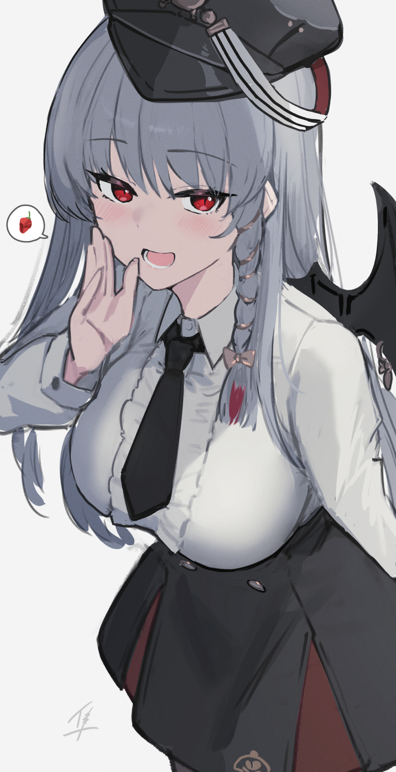 1girl black_hat black_necktie black_skirt black_wings blue_archive blush braid breasts collared_shirt cowboy_shot demon_wings fake_wings grey_hair haruna_(blue_archive) hat hayabusa_(vert_320) highres large_breasts long_hair long_sleeves looking_at_viewer necktie open_mouth peaked_cap red_eyes shirt side_braid signature simple_background single_wing skirt smile solo white_background white_shirt wings