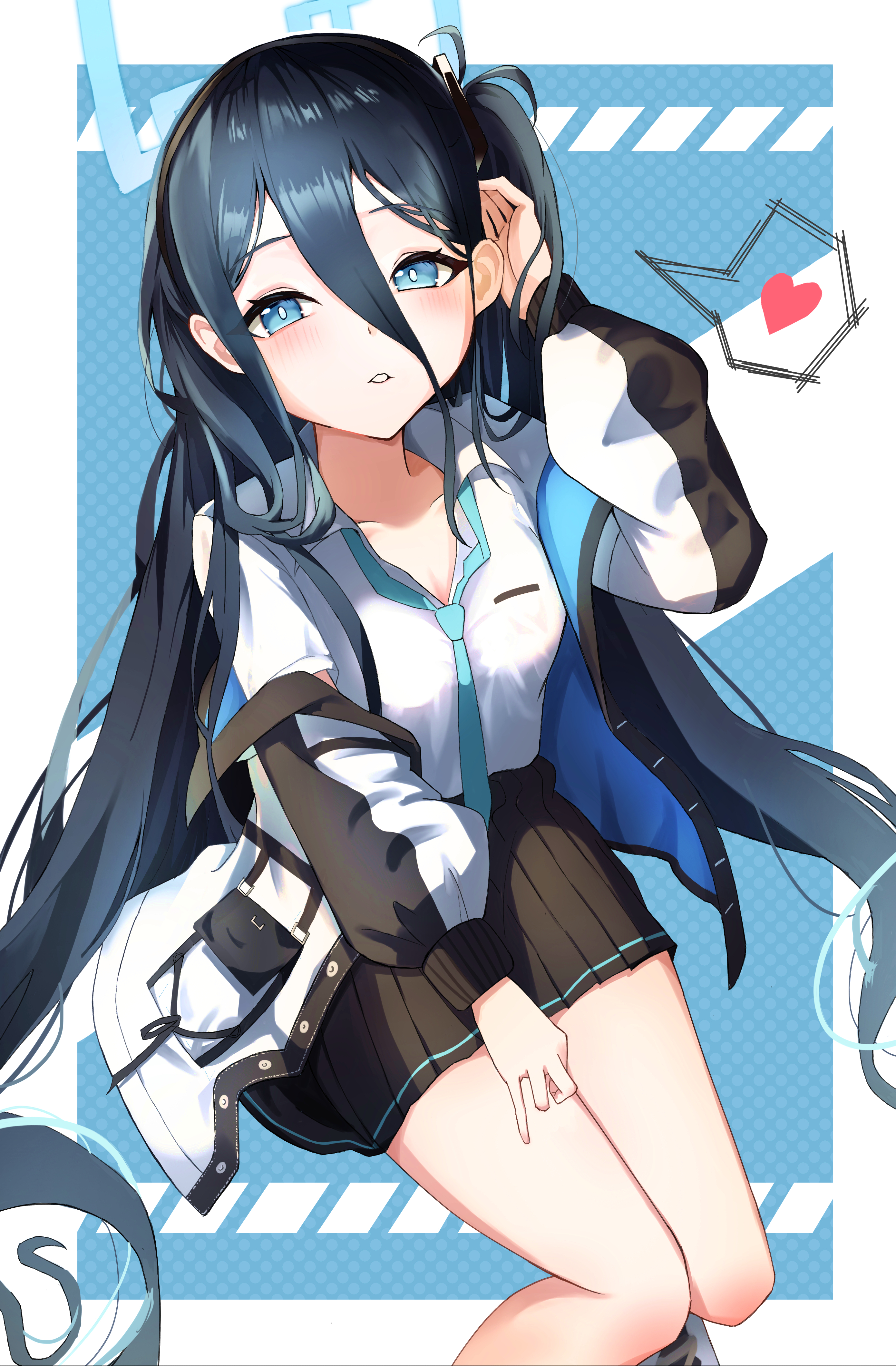 1girl absurdly_long_hair absurdres aris_(blue_archive) black_hair black_skirt blue_archive blue_eyes blue_halo blue_necktie blush collared_shirt feet_out_of_frame halo heart highres jacket kaminose long_hair long_sleeves looking_at_viewer necktie one_side_up open_clothes open_jacket open_mouth pleated_skirt shirt skirt solo spoken_heart very_long_hair white_jacket white_shirt