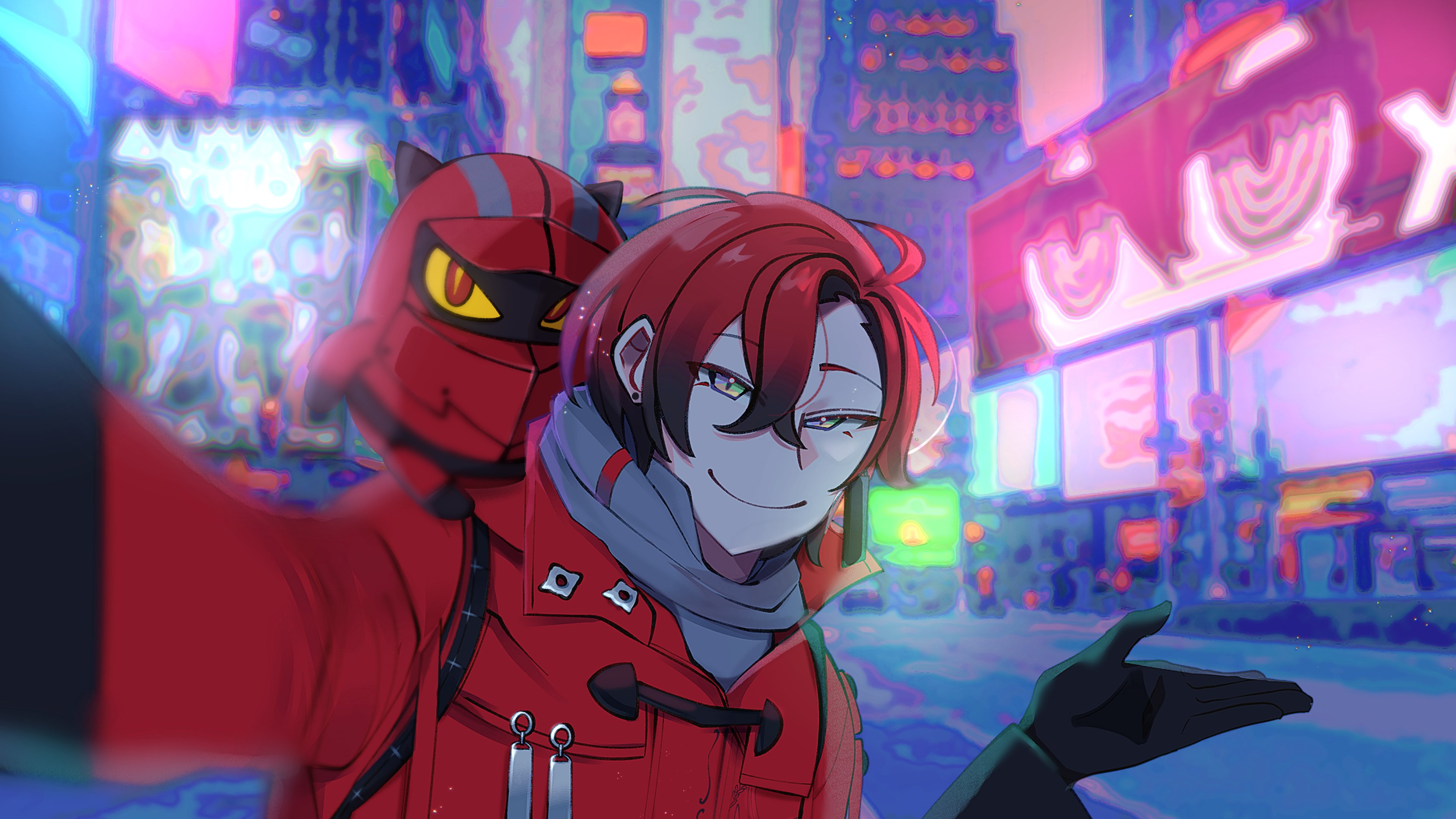 1boy absurdres black_gloves black_hair blurry blurry_background city city_lights coat commentary creature creature_on_shoulder depth_of_field earrings ella_eves english_commentary eyelashes foreshortening gloves gradient_hair green_eyes grey_scarf hair_between_eyes half-closed_eyes highres holostars holostars_english jewelry light_particles looking_at_viewer machina_x_flayon male_focus multicolored_eyes multicolored_hair on_shoulder orange_eyes outdoors r-trus_(machina_x_flayon) red_coat red_hair scarf selfie short_hair slit_pupils smile solo stud_earrings two-tone_hair upper_body virtual_youtuber