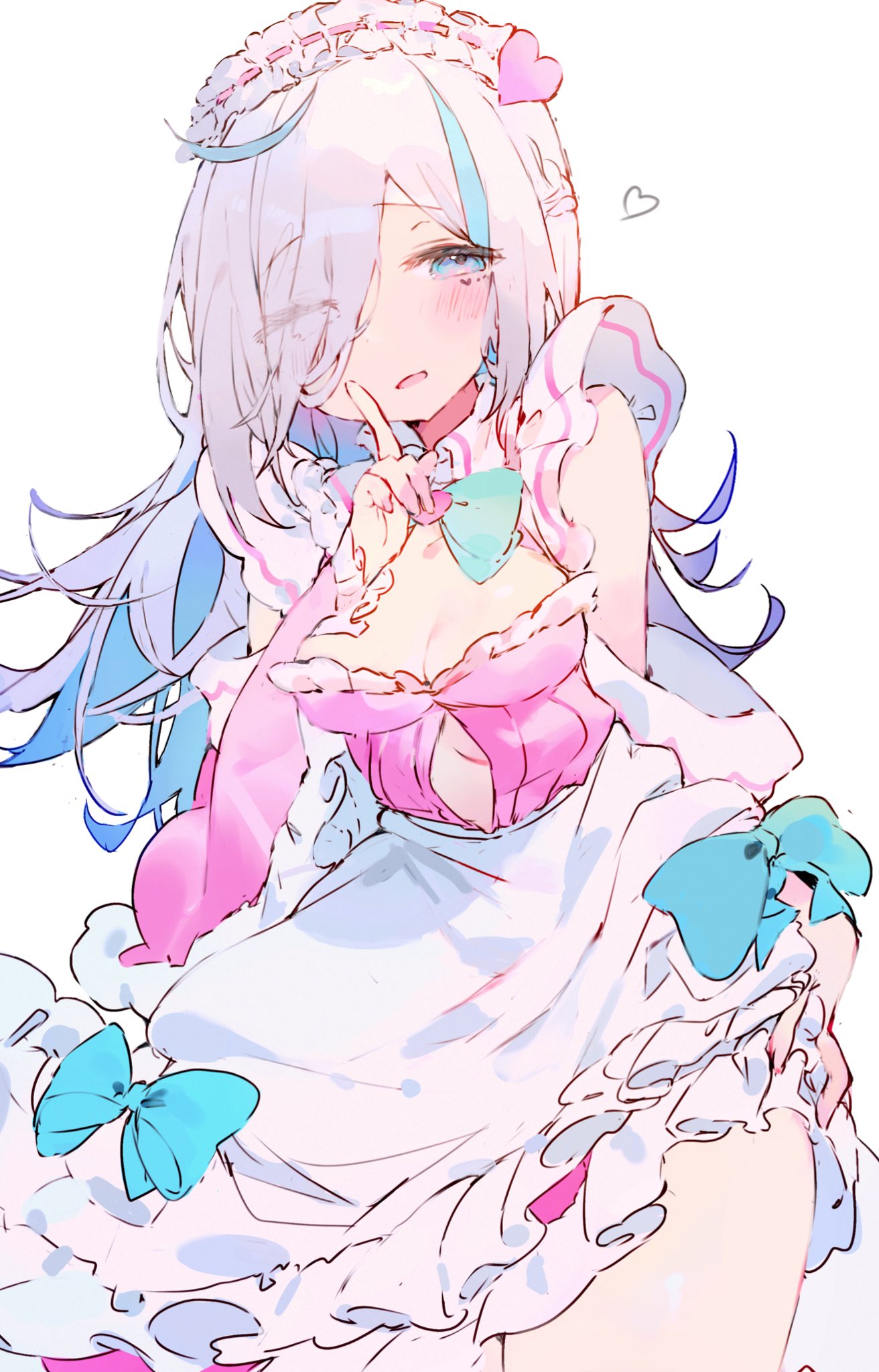 1girl apron aqua_hair bare_shoulders blue_bow blue_bowtie blue_eyes blush bow bowtie breasts bunchi cleavage cleavage_cutout clothing_cutout commission cowboy_shot dress facial_mark frilled_apron frills grey_hair hair_ornament hair_over_one_eye hand_up heart highres ilu_fluor index_finger_raised indie_virtual_youtuber maid maid_apron maid_headdress mole mole_under_eye multicolored_hair open_mouth parted_bangs pink_dress shoulder_cutout simple_background skeb_commission small_breasts smile solo thighs virtual_youtuber white_apron white_background