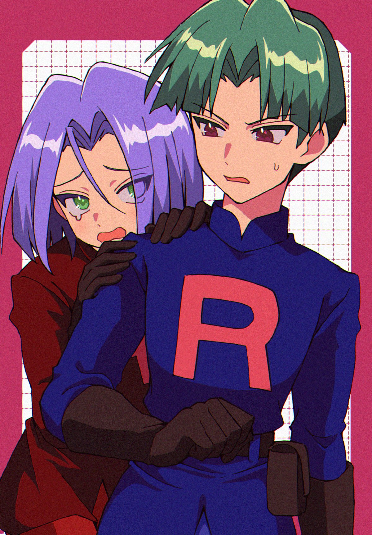 2boys black_gloves blue_hair brown_eyes butch_(pokemon) gloves green_eyes green_hair highres james_(pokemon) macchiromomomo male_focus multiple_boys nintendo pokemon pokemon_(anime) pokemon_(classic_anime) pokemon_hs12 scared sweatdrop team_rocket team_rocket_uniform teardrop tears