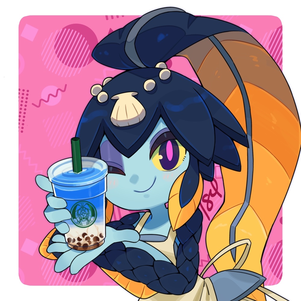 184nx 1girl apron blush bubble_tea colored_sclera cup disposable_cup drink drinking_straw fins fish_girl hair_ornament logo_parody minette_(skullgirls) one_eye_closed pink_background pink_pupils ponytail shell shell_hair_ornament skullgirls smile solo starbucks upper_body yellow_sclera
