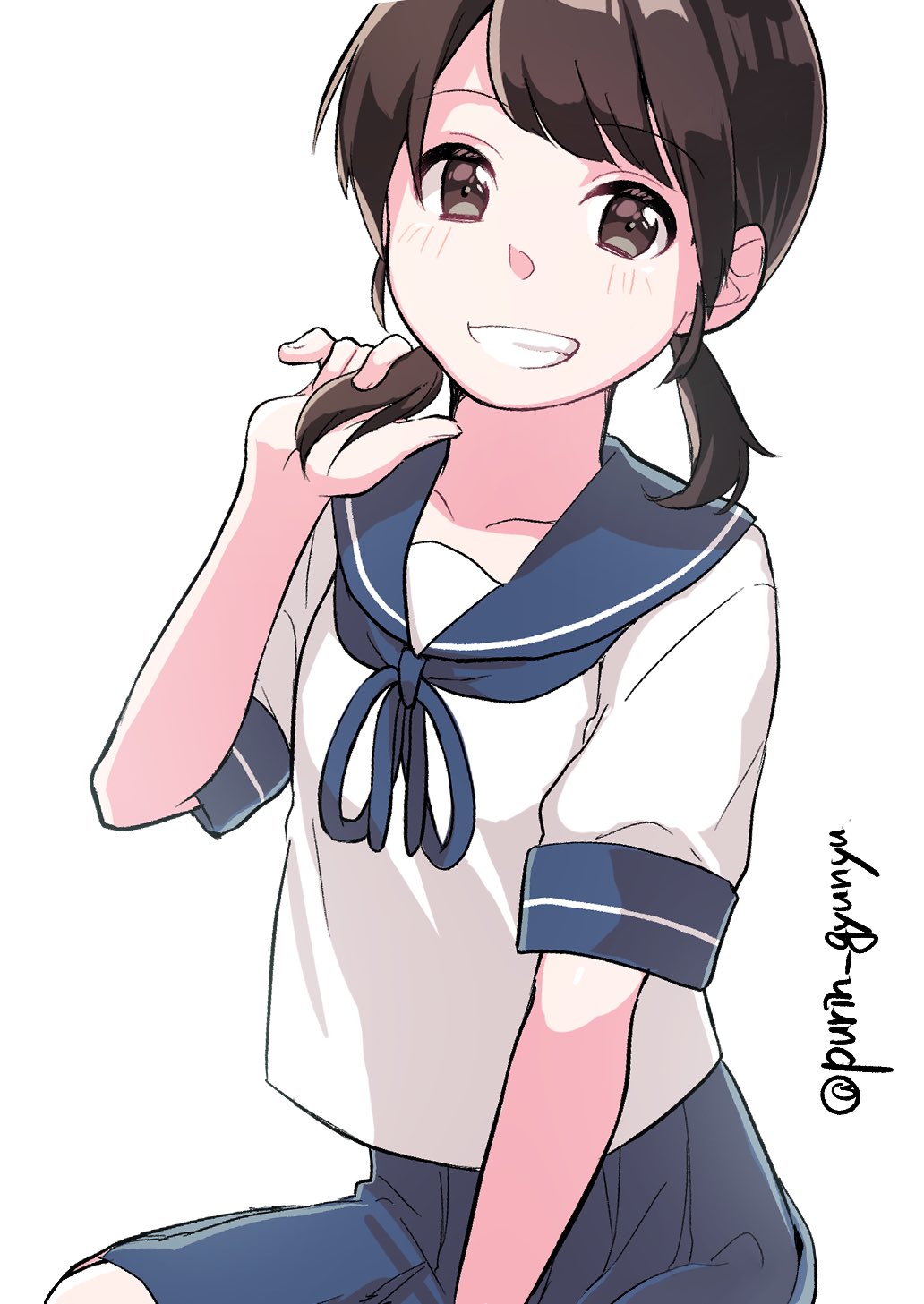1girl black_hair blue_neckerchief blue_sailor_collar blue_skirt brown_eyes highres kantai_collection looking_at_viewer low_twintails neckerchief niina_(purin_gyunyu) one-hour_drawing_challenge pleated_skirt sailor_collar school_uniform serafuku shirayuki_(kancolle) shirt short_hair simple_background skirt smile solo twintails twitter_username white_background white_shirt