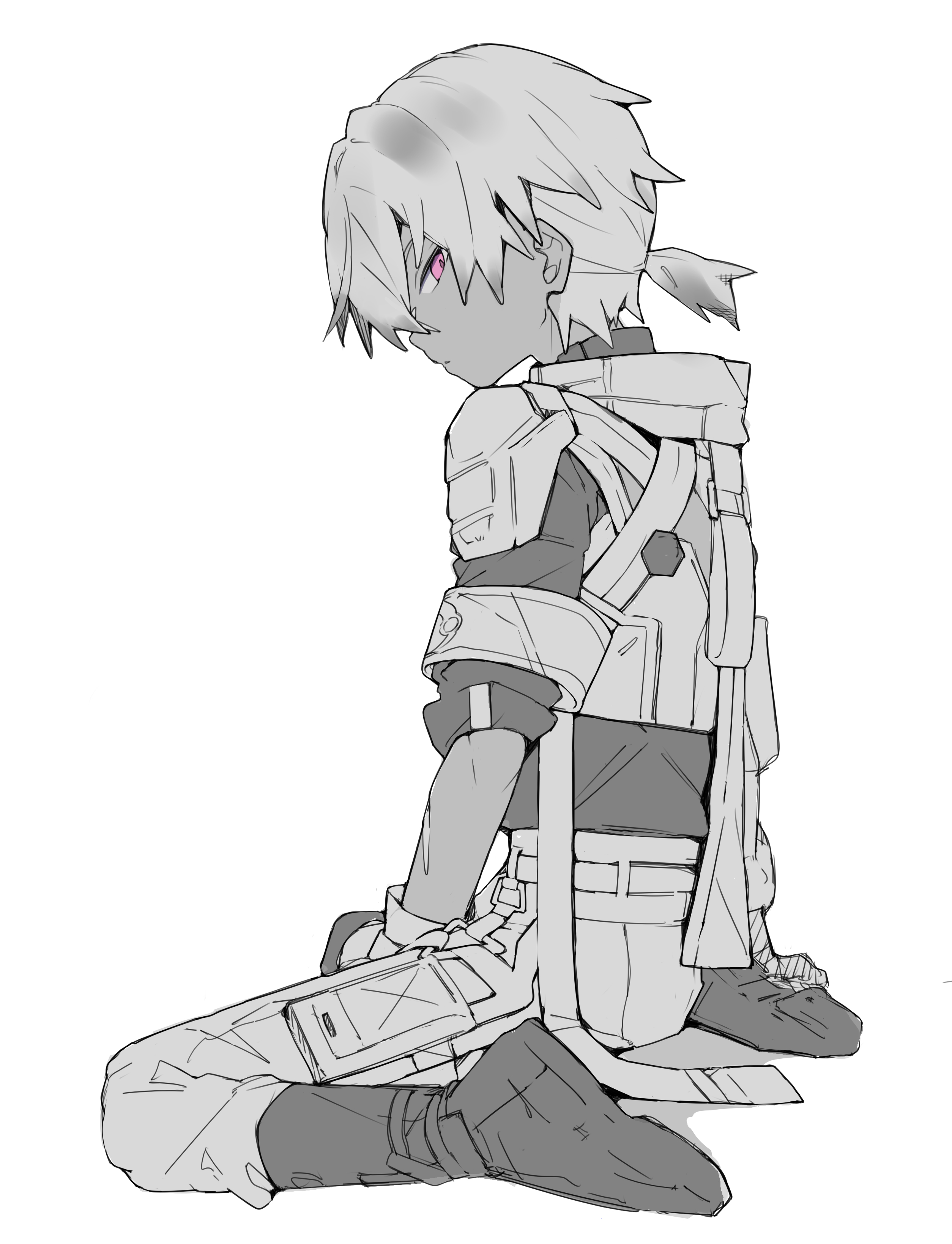 1boy absurdres arlan_(honkai:_star_rail) boots closed_mouth greyscale hair_between_eyes highres honkai:_star_rail honkai_(series) looking_at_viewer makimag male_focus monochrome multicolored_hair pants pink_eyes ponytail scar scar_on_arm short_ponytail simple_background sitting solo spot_color