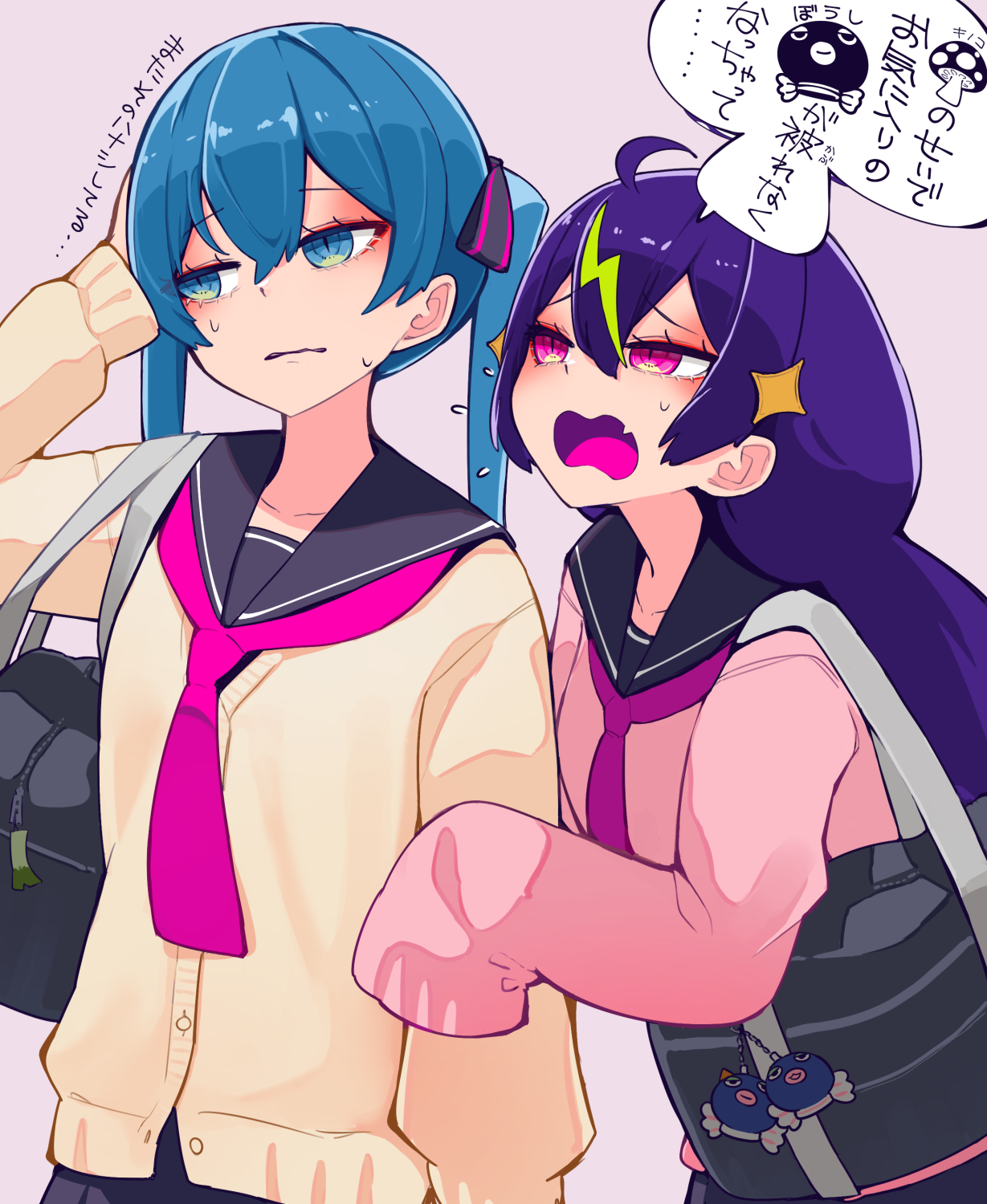2girls ahoge arm_up bag bag_charm black_bag blue_bow blue_eyes blue_hair blue_sailor_collar blue_serafuku blue_shirt blue_skirt bow buttons cardigan charm_(object) closed_mouth commentary cosmo_(bousoup) cowboy_shot double-parted_bangs eyelashes fang flying_sweatdrops furrowed_brow green_hair hair_between_eyes hair_bow hand_on_own_head hatsune_miku highres holding_another's_arm kinoko_ga_haeteru!!_(vocaloid) long_bangs long_hair long_sleeves looking_at_another looking_up multicolored_hair multiple_girls mushroom necktie open_mouth otomachi_una otomachi_una_(spicy) pink_cardigan purple_background purple_eyes purple_hair purple_necktie sailor_collar school_bag school_uniform serafuku shirt simple_background skin_fang skirt sleeves_past_fingers sleeves_past_wrists slit_pupils sparkle_hair_ornament speech_bubble spoken_mushroom spring_onion streaked_hair sweat sweatdrop talking translation_request twintails two-tone_hair untranslatable_commentary vocaloid yellow_cardigan zipper
